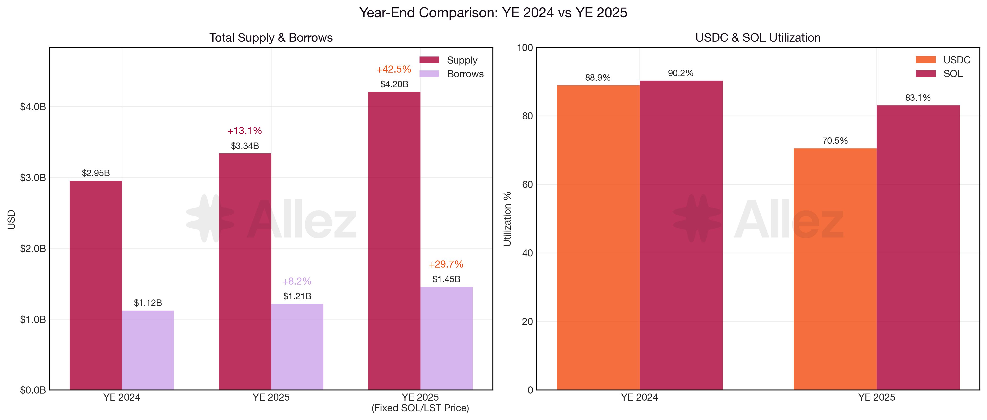 The chart below tracks how utilization evolved throughout 2025 for the two core assets. Note how SOL utilization consistently runs higher than USDC - reflecting the leverage demand described above.