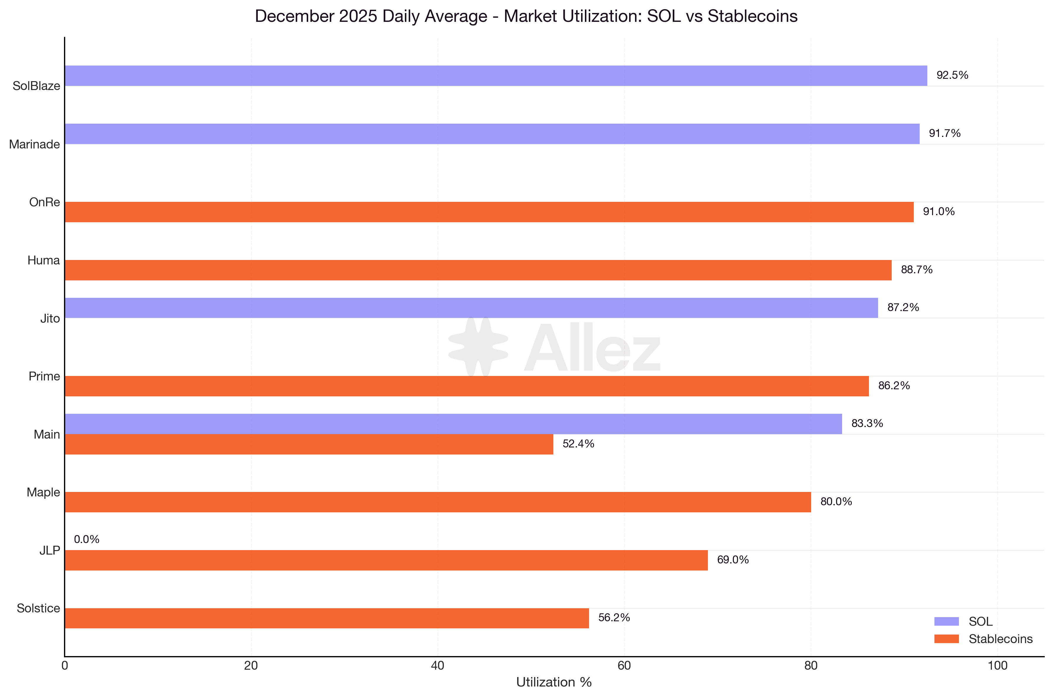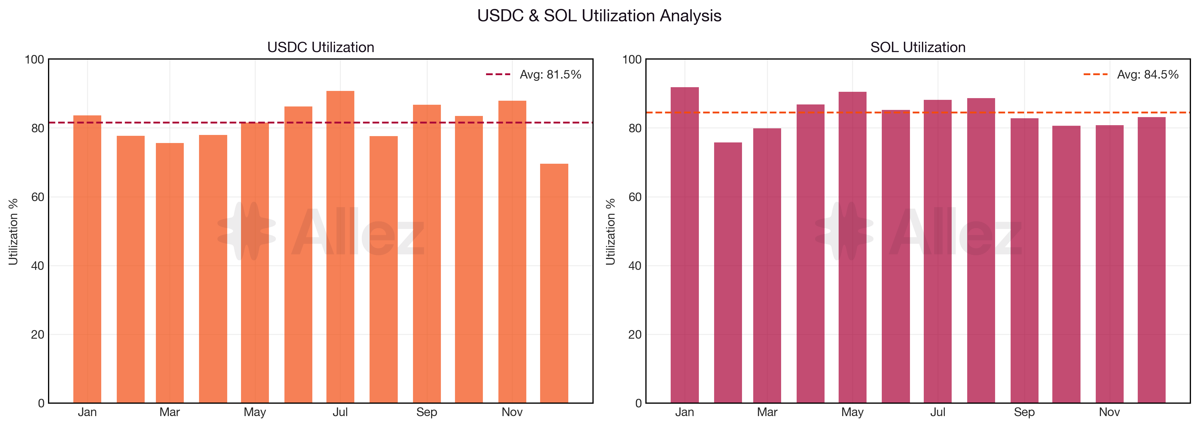 Both USDC (~60-80%) and SOL (~80-90%) maintained high utilization throughout 2025, demonstrating sustained borrowing demand across market conditions.