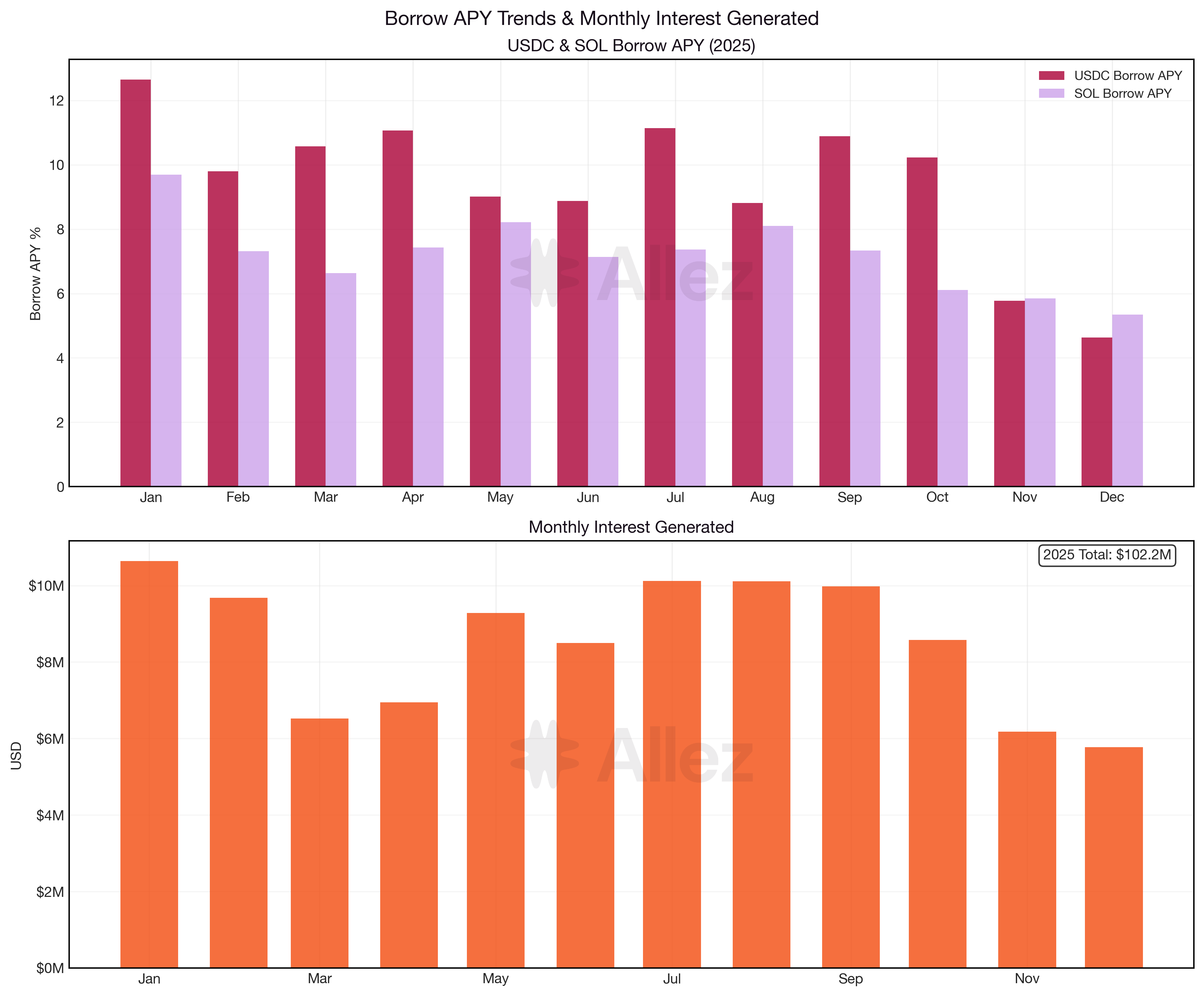 Borrow APYs fluctuated with utilization - USDC ranged from ~5% to 15%, while SOL often exceeded USDC due to intense leverage demand. December’s rate compression (SOL borrow from 6.2% to 4.7%) reflects curve optimizations for looping strategies, it follows global reduced demand.