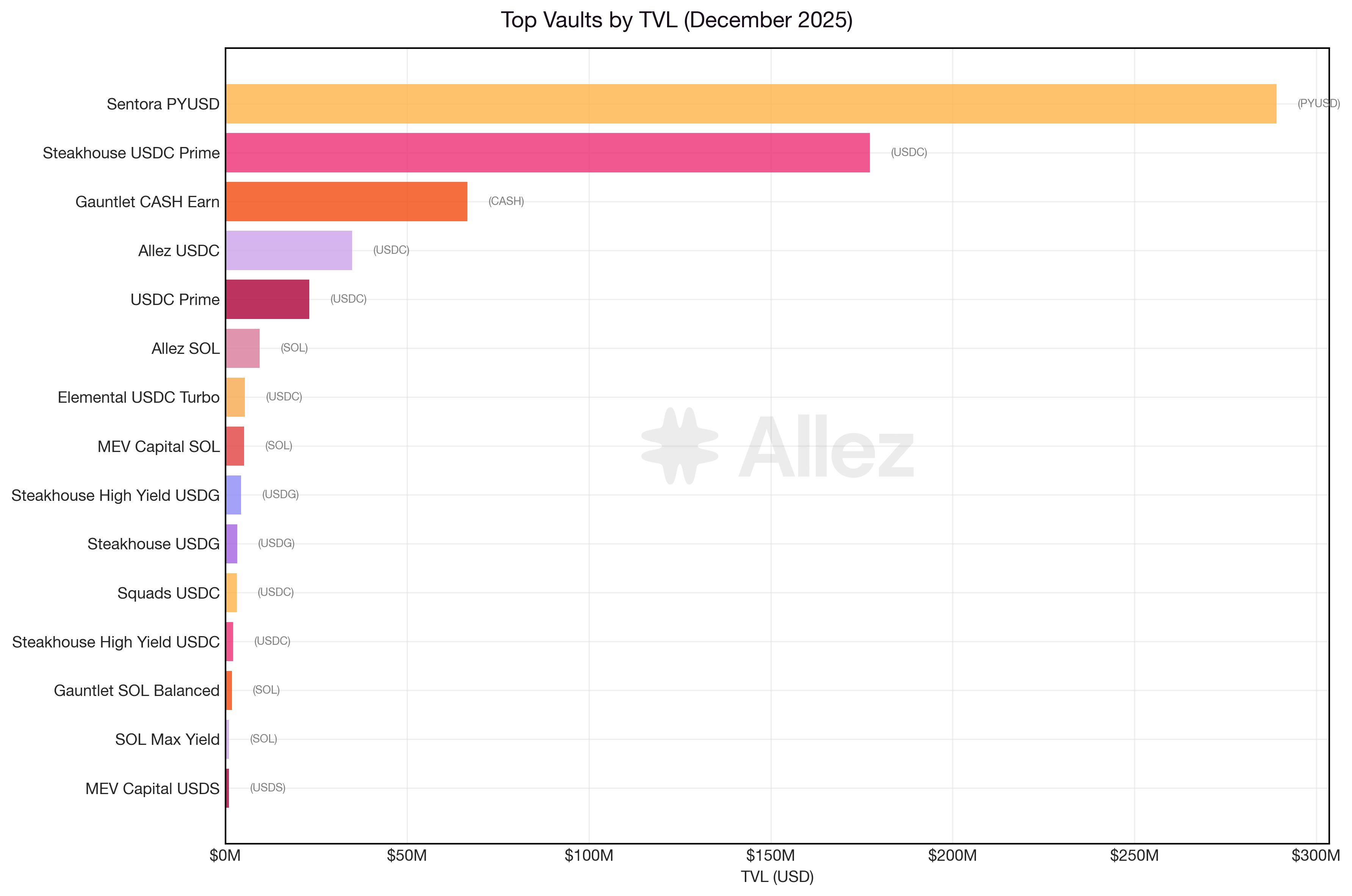 Vault liquidity reached $620M+, growing against the broader protocol consolidation trend. The vault ecosystem now represents curated institutional-grade capital management infrastructure - 9 curators operating 23 strategies across stablecoins and SOL