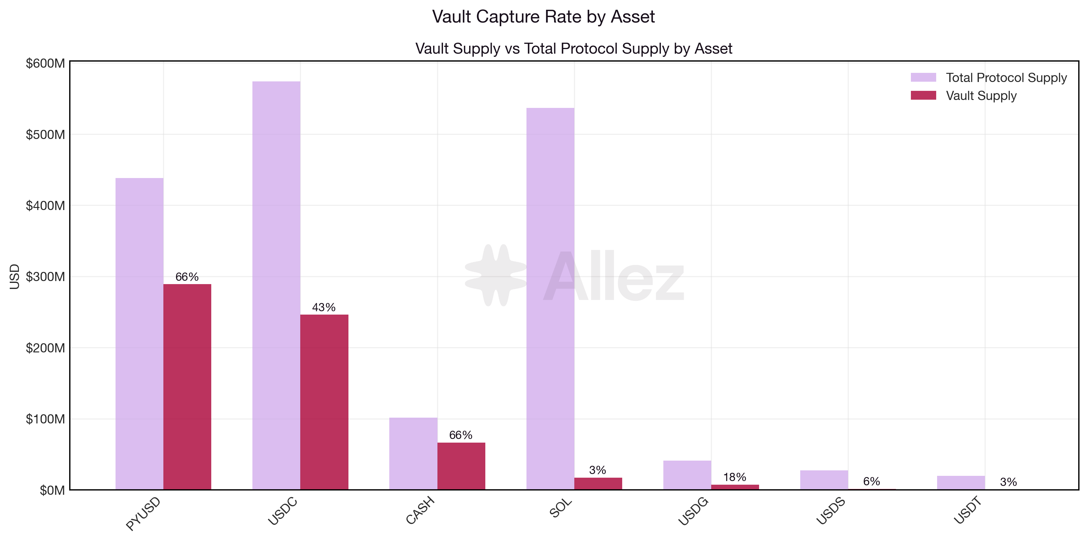 While formally the only way for lent capital to ender a market was through direct deposits, vaults now can dynamically facilitate deposits across markets. While some assets such as USDT have low vault adoption (18%), others such as PYUSD and USDC (66% and 43% respectively) have much higher rates.