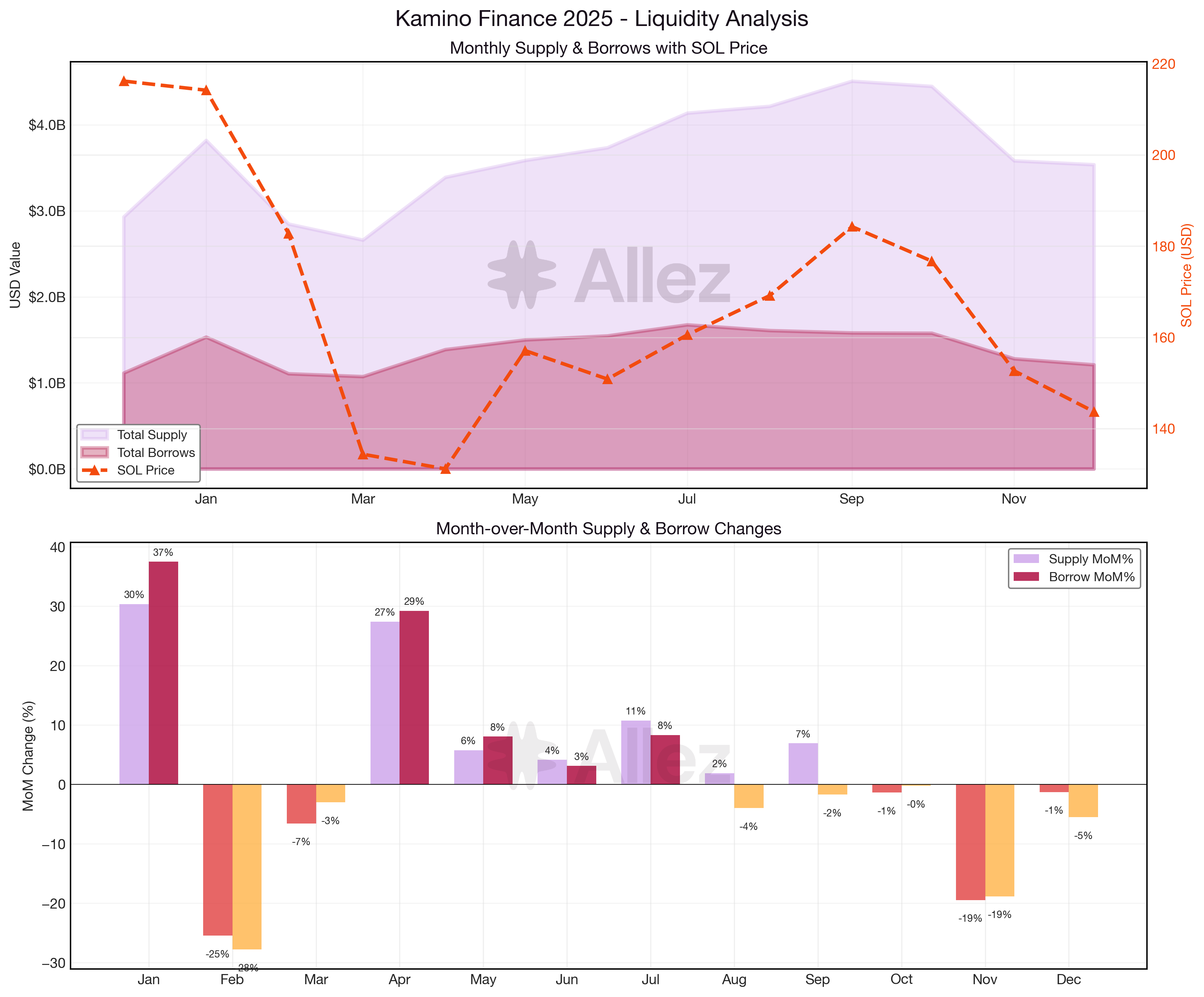 This section examines how protocol liquidity evolved throughout 2025 -its correlation to SOL price, the year's supply swings, and the deliberate rebalancing toward stablecoin and RWA assets.