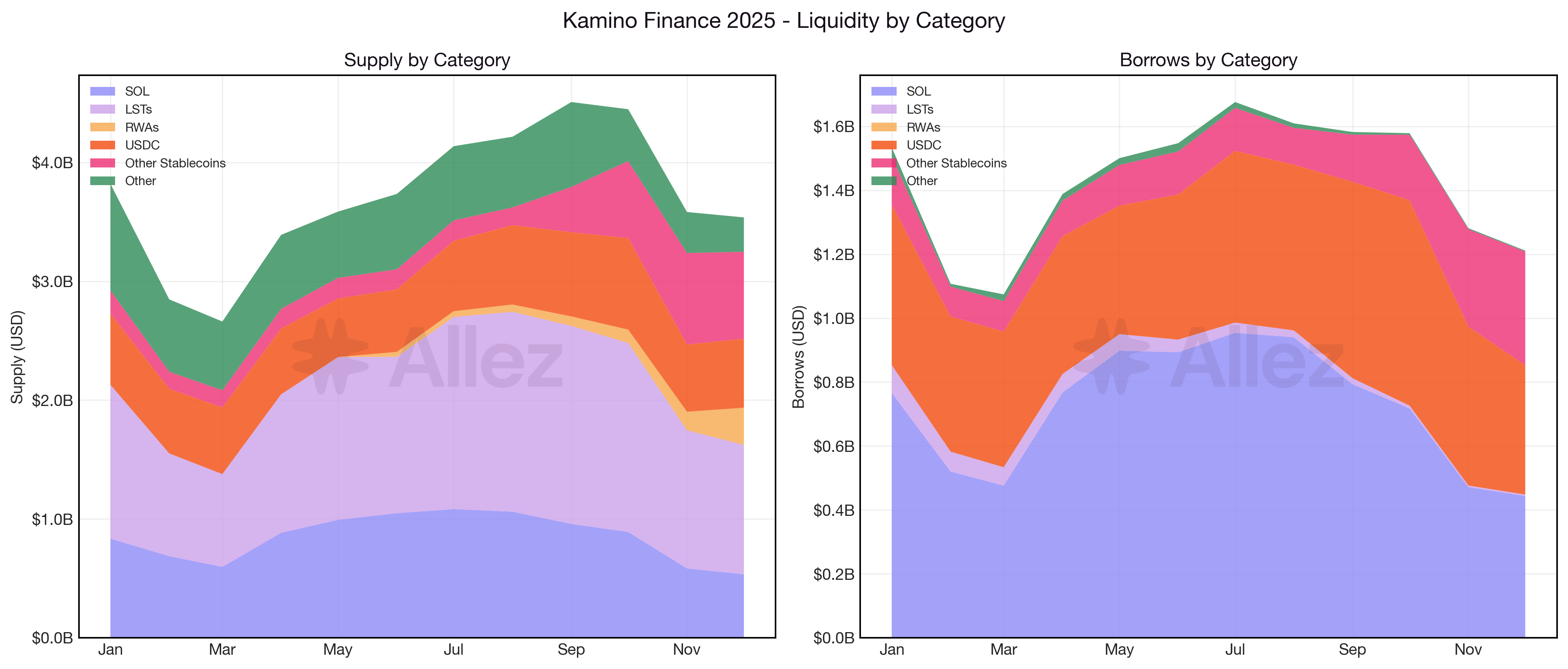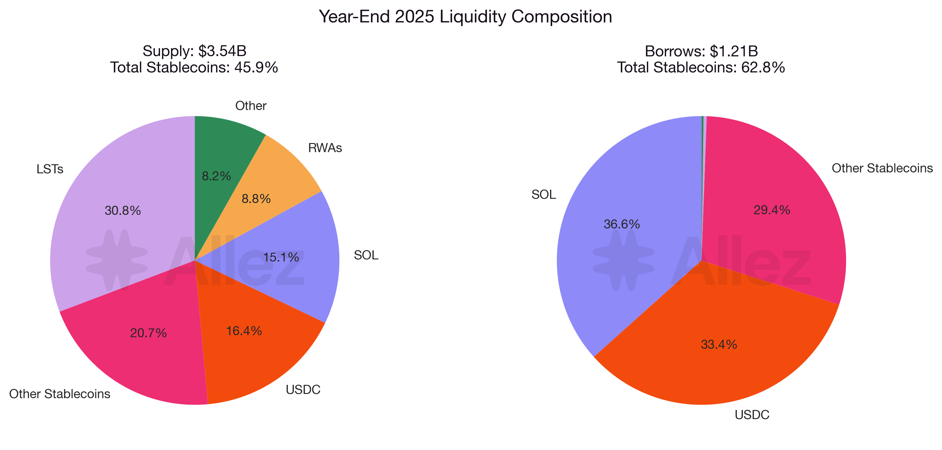 This price sensitivity drove the year's strategic priority: diversification. Through deliberate expansion into RWA and stablecoin markets, these assets grew from a minority position to reach parity with SOL/LST assets - both now at 45.9% each. The result: liquidity flows and yield that are increasingly insulated from crypto market cycles.