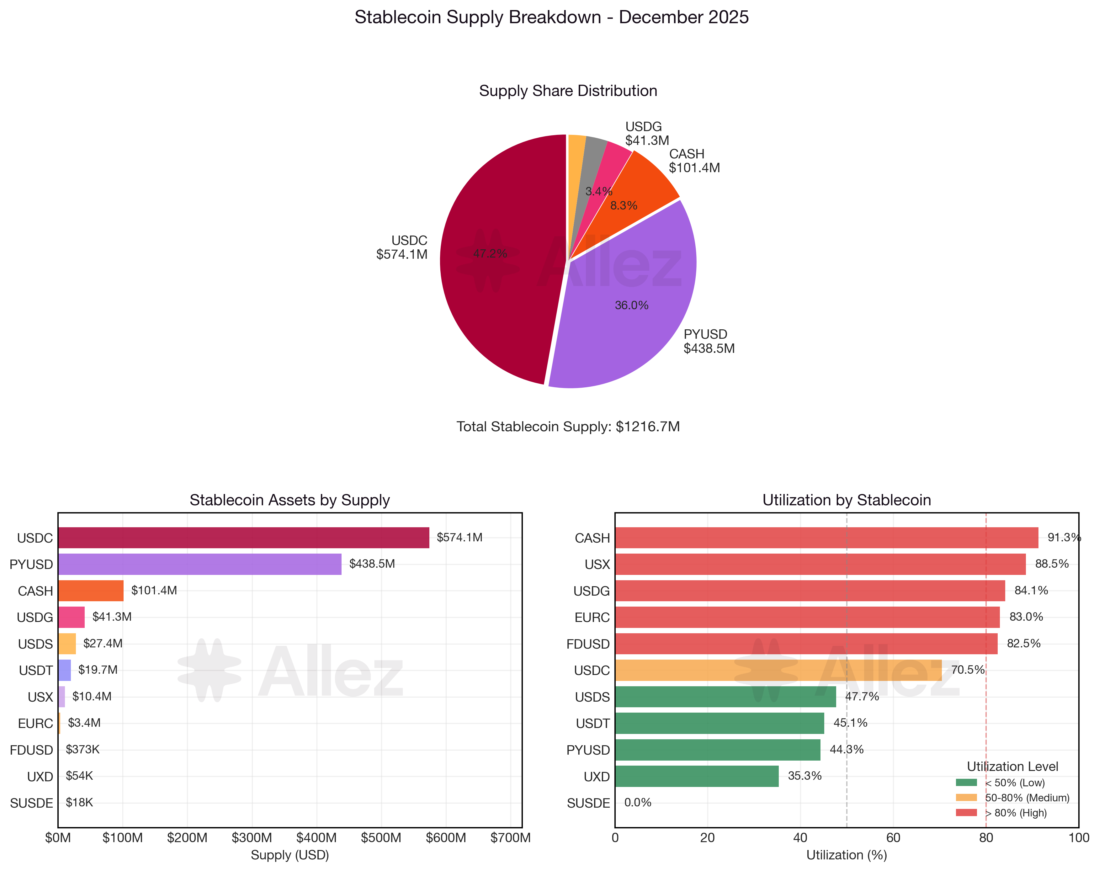 This balance emerged through deliberate diversification. RWAs grew from near-zero to $307M, PYUSD expanded to $530M, and specialized stablecoins (CASH, USDG) gained traction in yield strategies.