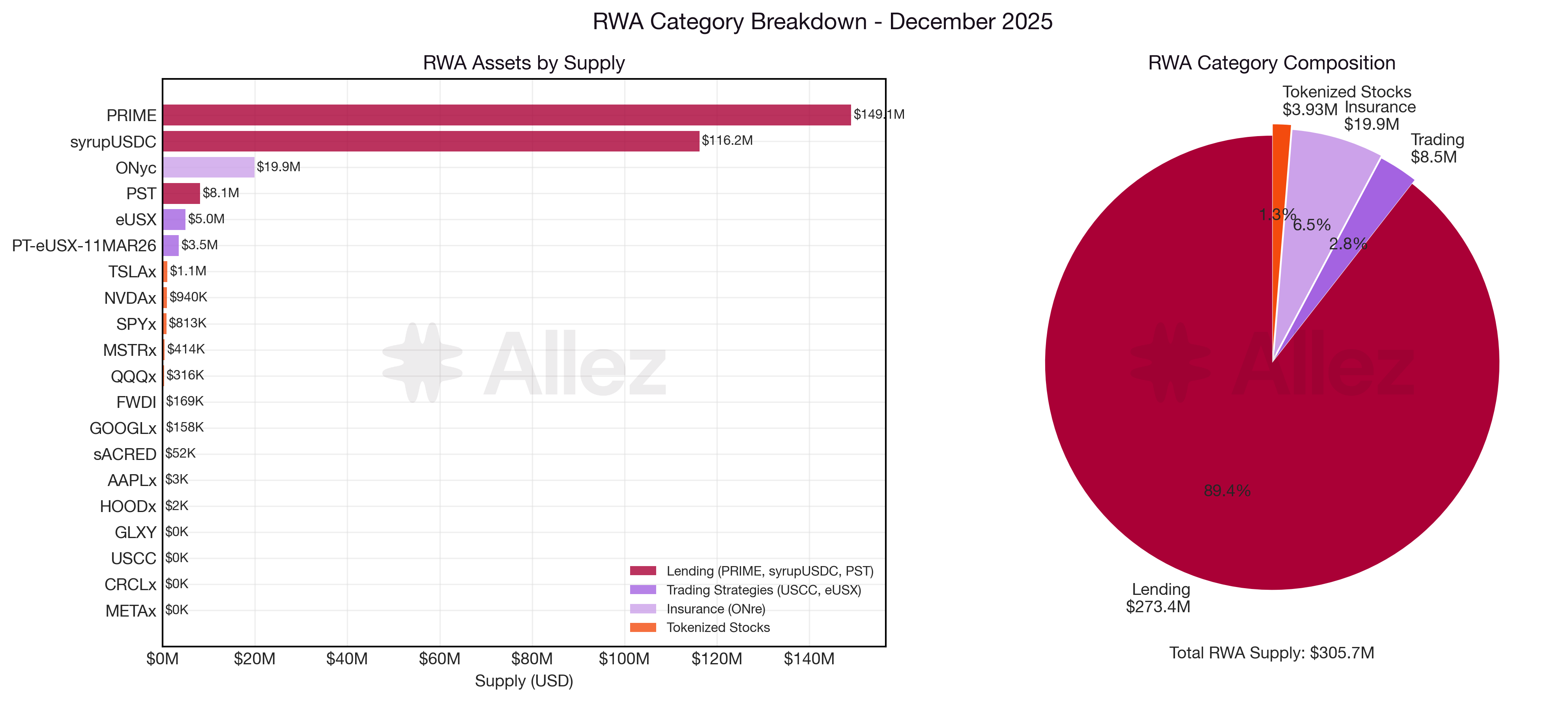 The year's breakthrough came from real-world assets and yield-bearing instruments that bring off-chain credit markets on-chain. RWAs grew from near-zero to $307M, representing the fastest-growing asset category on the platform.