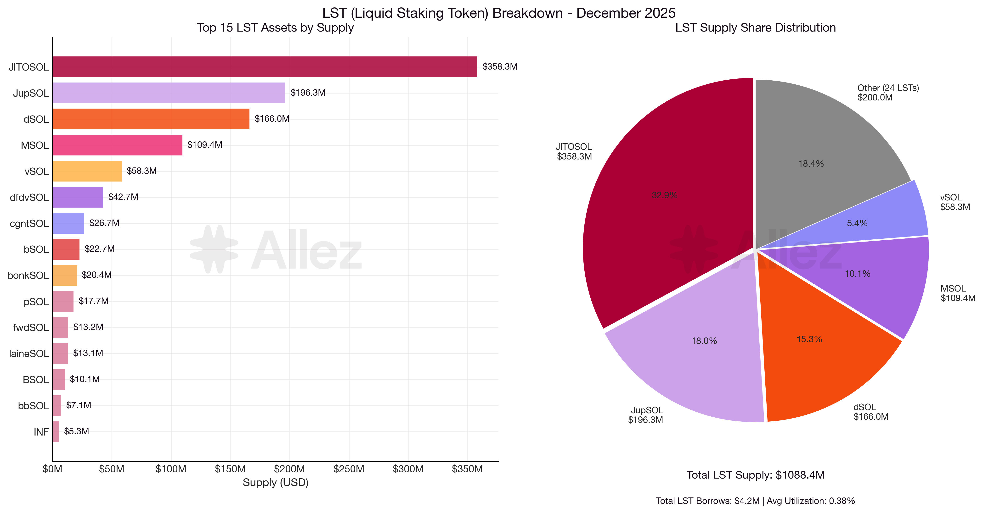 The top 5 LSTs (JitoSOL, JupSOL, dSOL, mSOL, vSOL) account for 81.6% of all LST supply. Near-zero utilization reflects LSTs’ role as collateral, not borrowed assets. Users deposit LSTs to borrow SOL or stablecoins for leverage strategies. The 0.38% utilization represents the small portion borrowed for arbitrage or market-making.