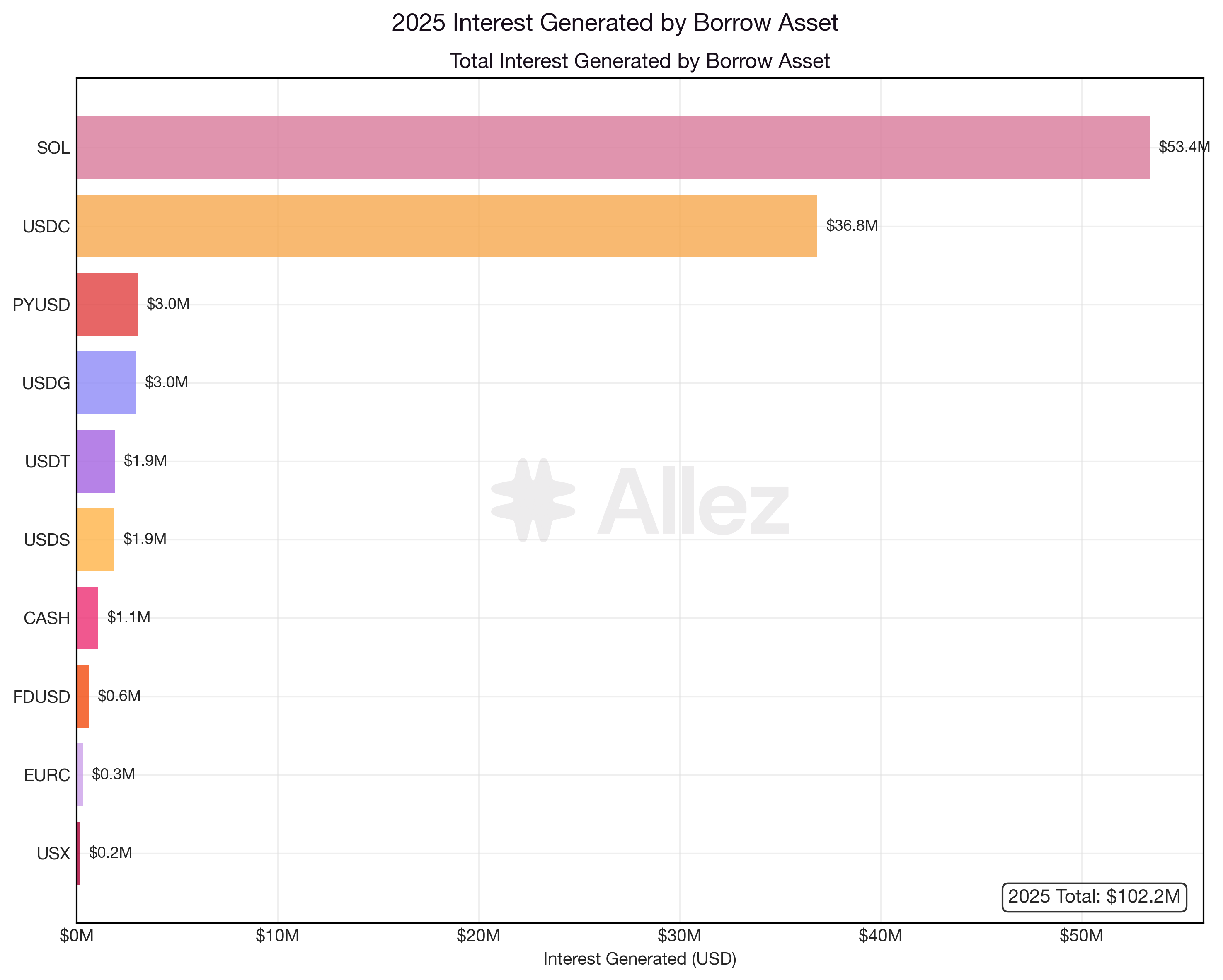 Combined with LSTs ($1.09B), the native SOL ecosystem totals $1.62B - the engine that drives 52% of all interest generation through “SOL multiply” strategies where users deposit LSTs and borrow SOL to create leveraged staking positions.