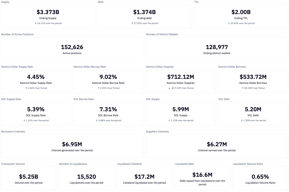 User activity remained strong with 152.6K active positions and nearly 129K wallets, reinforcing Kamino’s role as Solana’s core credit layer.