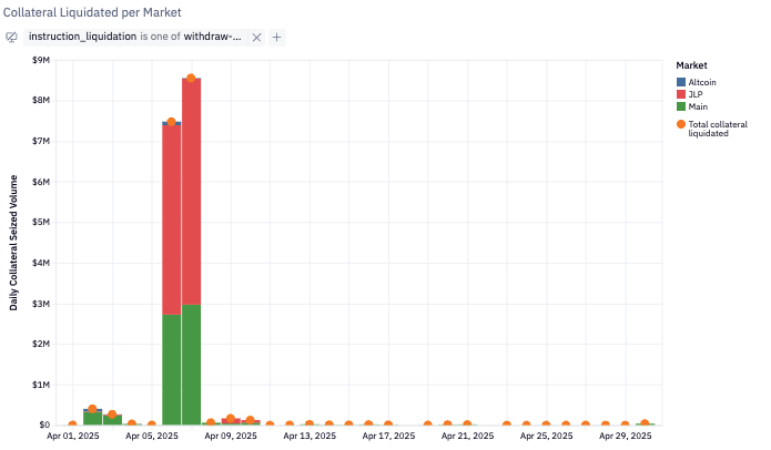 Total collateral seized in April amounted to $17.2M (—11.3% MoM), with $16.6M in corresponding repaid debt — broadly in line with March. Activity was concentrated in the JLP and Main markets, which together represented over 99% of total liquidations. JLP alone accounted for $10.47M in seized collateral (up MoM), reflecting the high-leverage of the JLP market. SOL-correlated collateral (SOL + JitoSOL) made up over $6.7M of all seized positions.