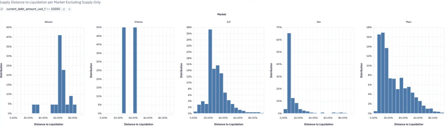 Notably, over 60% of JLP accounts sits within 30% of their liquidation threshold, reaffirming JLP’s role as Kamino’s most risk-tolerant isolated market. By contrast, Altcoin and Main market positions displayed wider collateral margins.