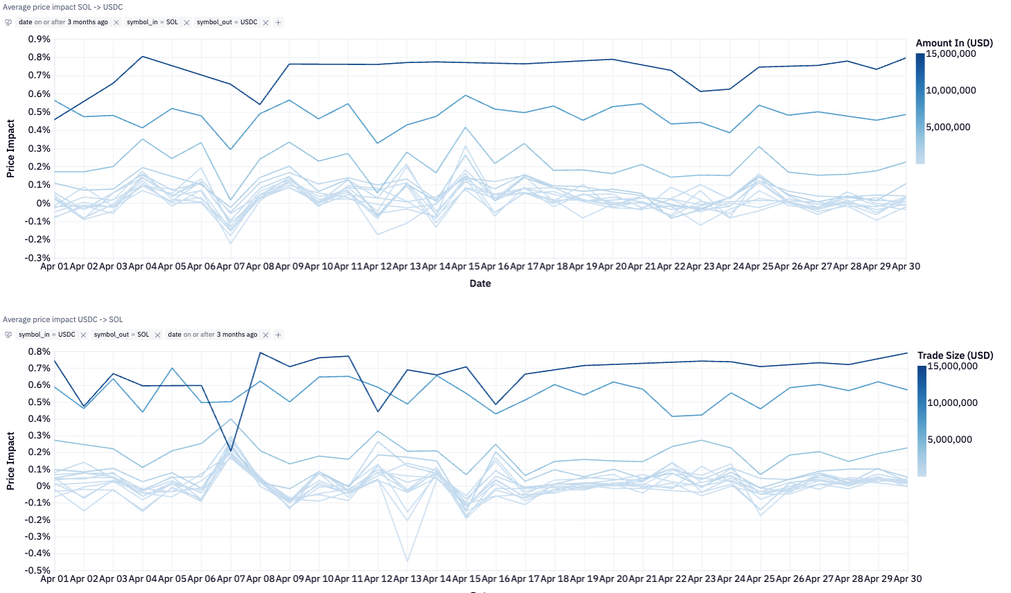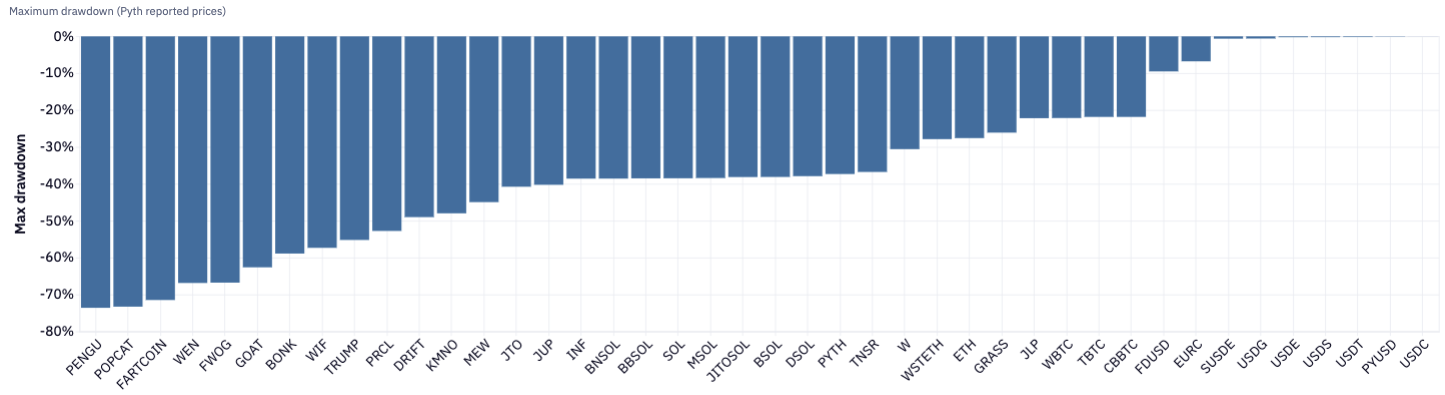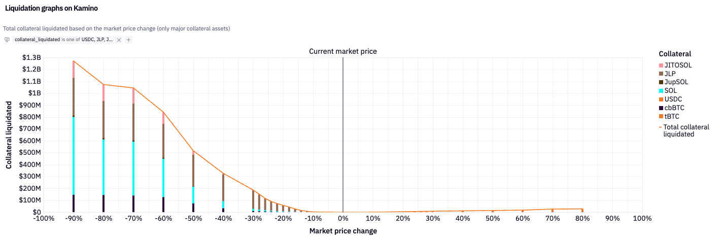 In the event of a market shock, dominant collaterals SOL, JitoSOL & JupSOL, and JLP would be the first to face liquidation exposure. These assets are also the most liquid and composable on Solana, enabling graceful position unwinding with limited price impact. Trade size analysis shows low slippage and stable price impacts for large sizes across USDC–SOL pairs.