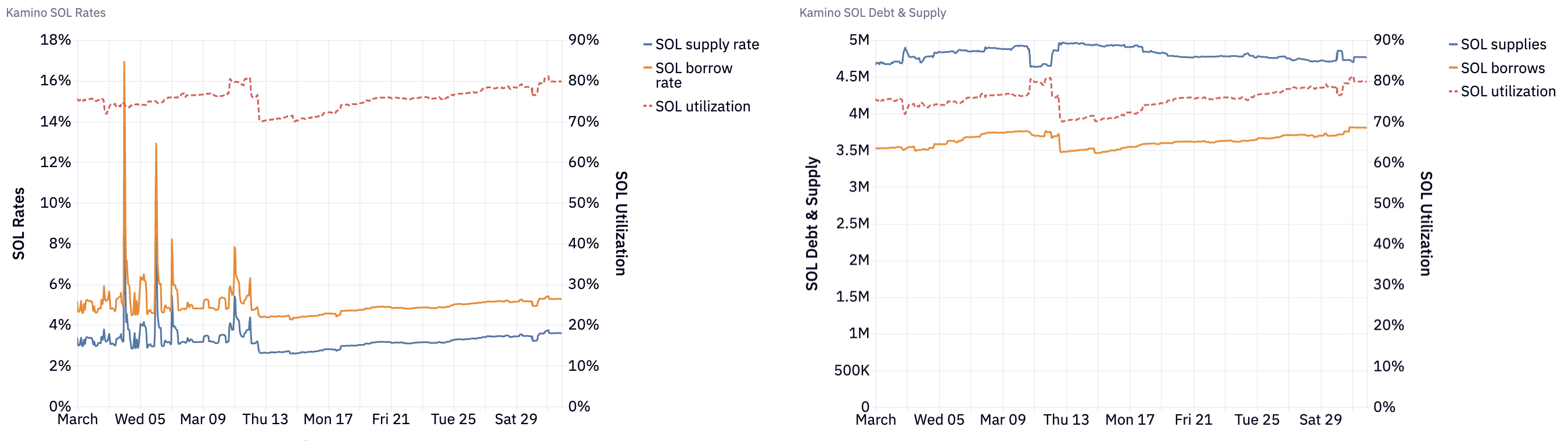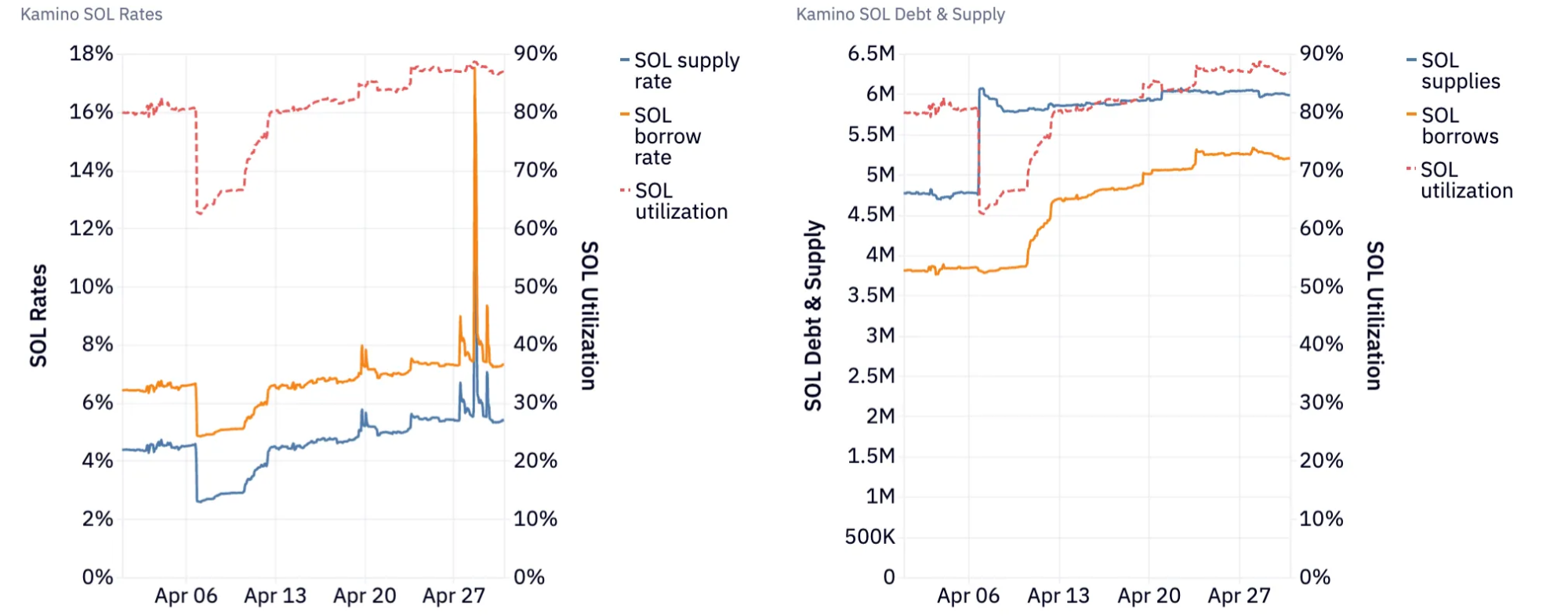 April marked a strong month for Kamino’s core markets, with sustained demand for leverage and continued growth in SOL-denominated activity. Both stablecoin and SOL markets recorded healthy utilization, supporting stable protocol revenue.