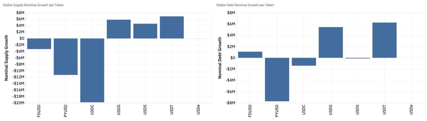 Inflows were concentrated in USDG, USDT, and USDS — all of which saw higher supply, with USDG and USDT also recording increased borrowing. Declines in USDC and PYUSD reflected tapering incentive programs.