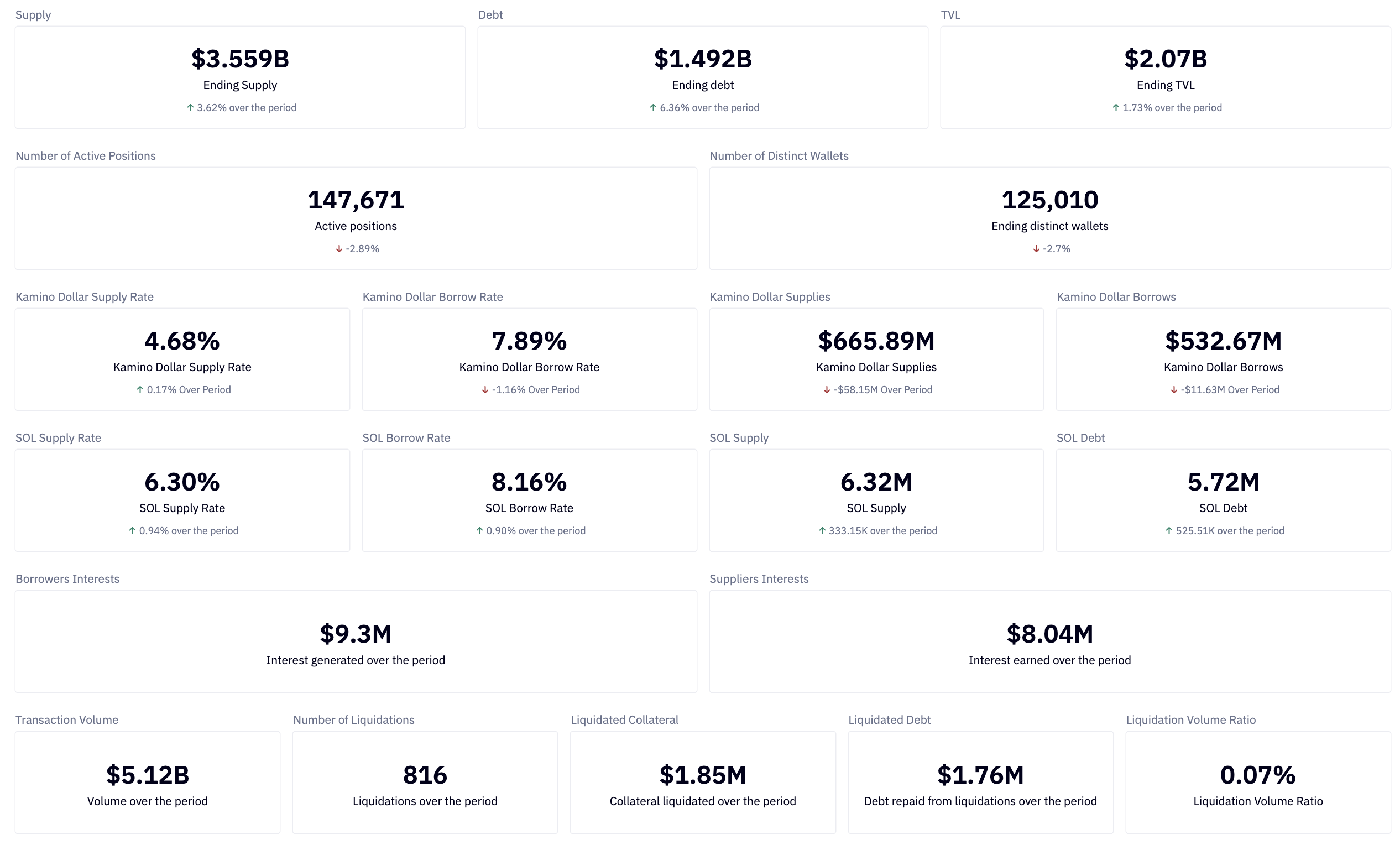 SOL markets remained a key driver, with supply expanding to 6.32M SOL (+333K) and debt to 5.72M SOL (+525K) with rising utilization and rates. In contrast, Kamino Dollar markets saw modest pullbacks, with supplies and borrows dipping slightly.