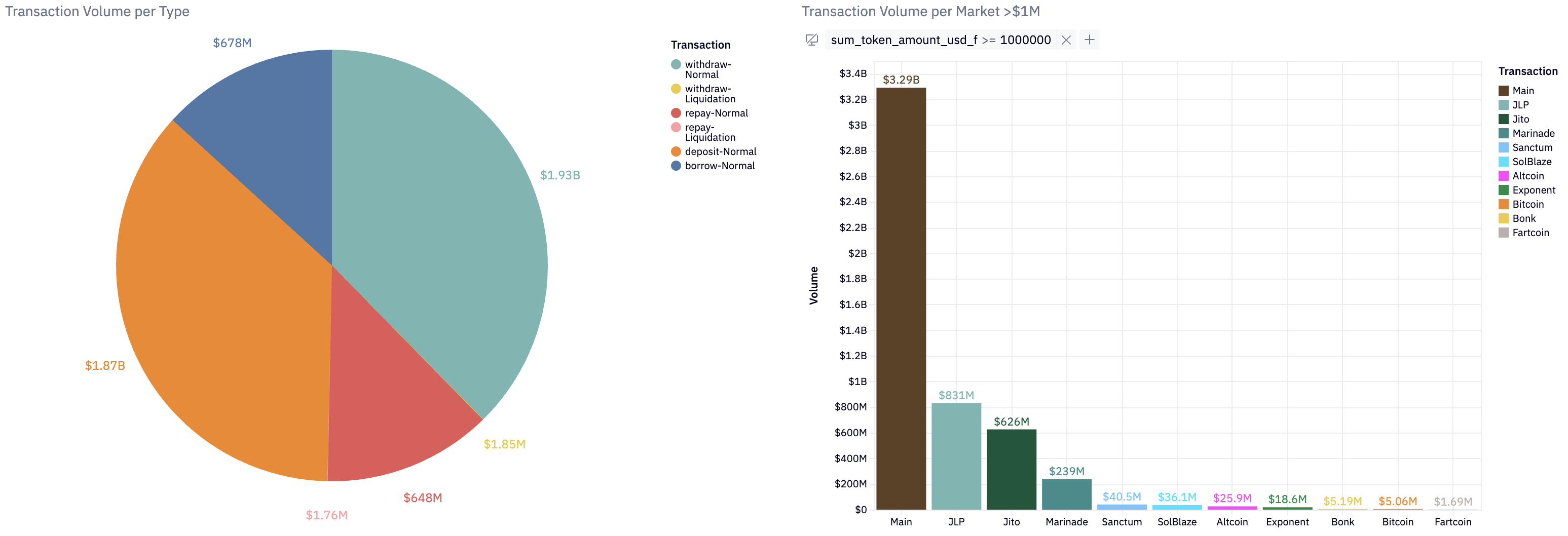 The Main Market remained dominant with $3.29B in volume, 64% of the total. JLP followed with $831M (–2.2% MoM), and Jito recorded $626M (–11.5% MoM). These modest declines reflect seasonality and in some cases capital migration to newer, more subsidized V2 markets and vaults.