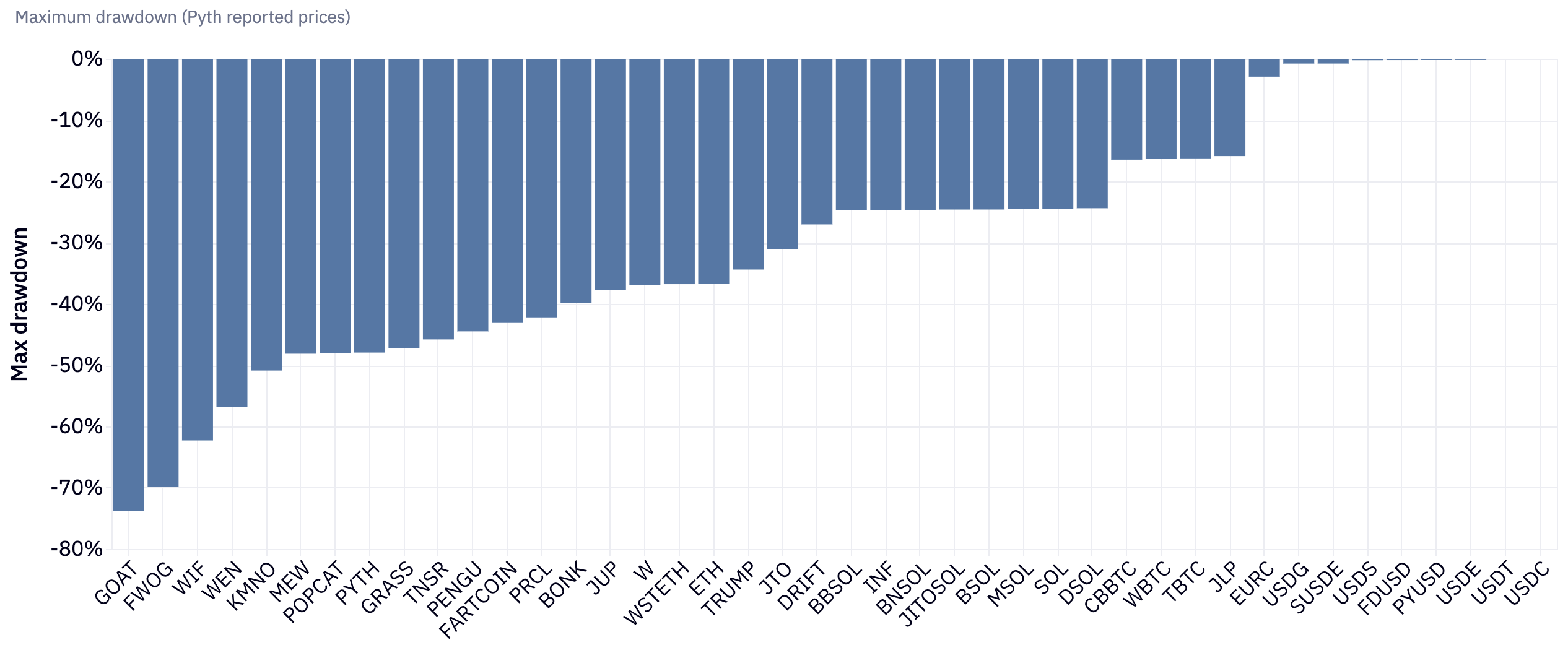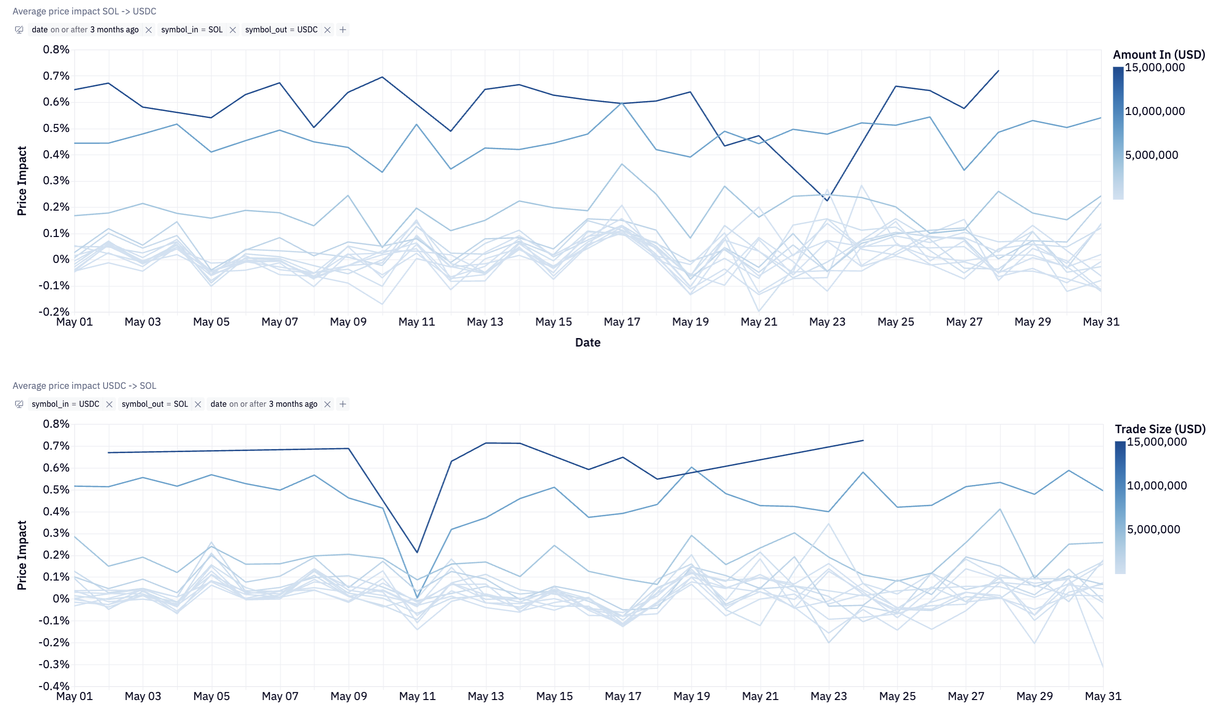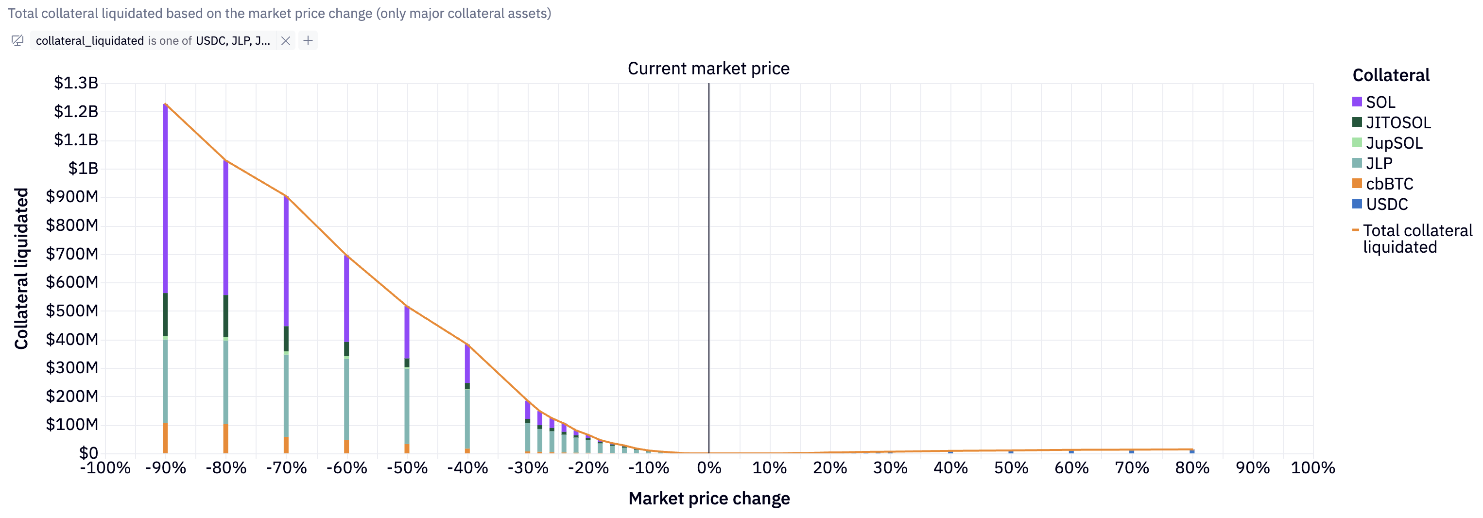 In the event of a market shock, dominant collaterals SOL and JLP would be the first to face liquidation exposure. These assets are also the most liquid and composable on Solana, enabling graceful position unwinding with limited price impact. Trade size analysis shows low slippage and stable price impacts for large sizes across USDC–SOL pairs.