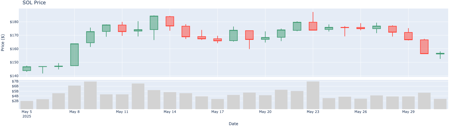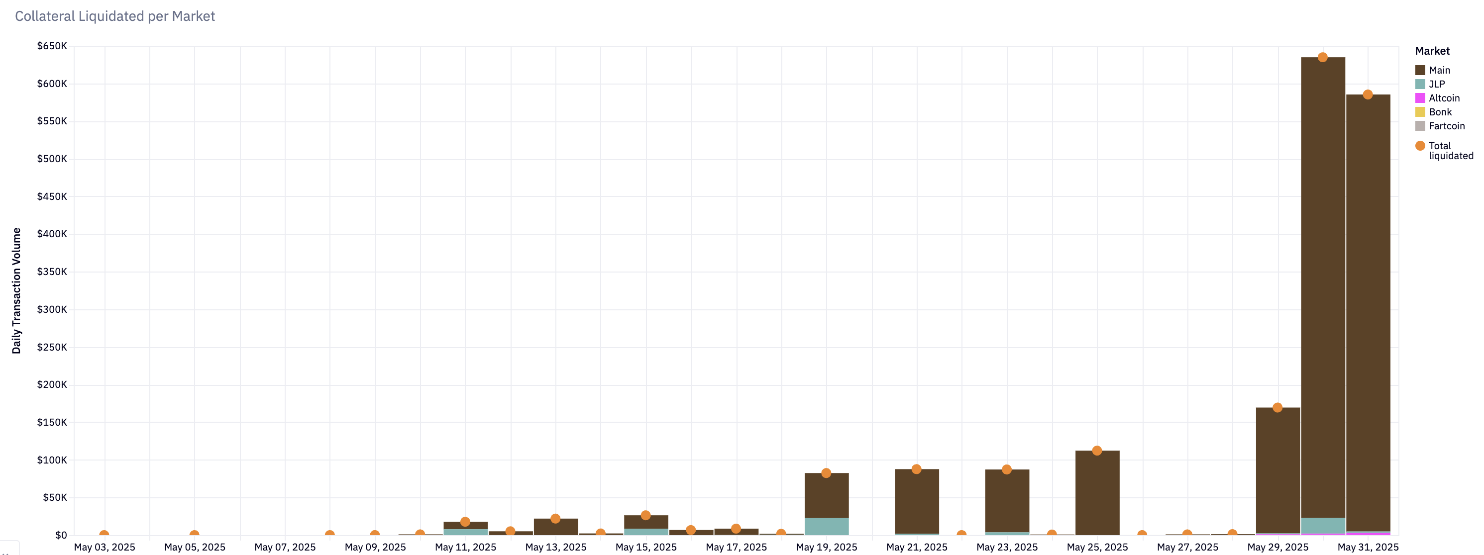 After subdued volatility throughout most of May, liquidation activity remained low and well-distributed, despite several long-tail assets experiencing sharp drawdowns. Core assets such as SOL, JitoSOL, and mSOL saw only moderate drawdowns (10–20%).