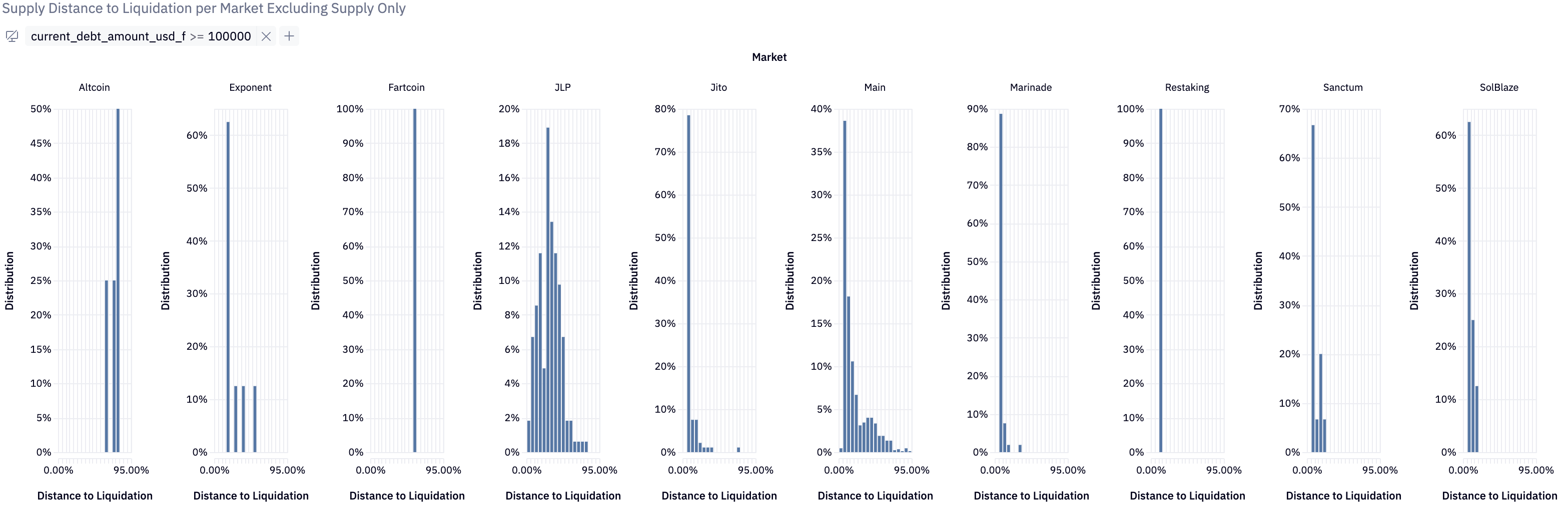 New V2 markets especially those centered around LSTs like Marinade, and PT show narrow distance to liquidations but lower liquidation risk ast these markets benefit from strong correlation between supplied and borrowed assets, limiting net exposure during price swings.