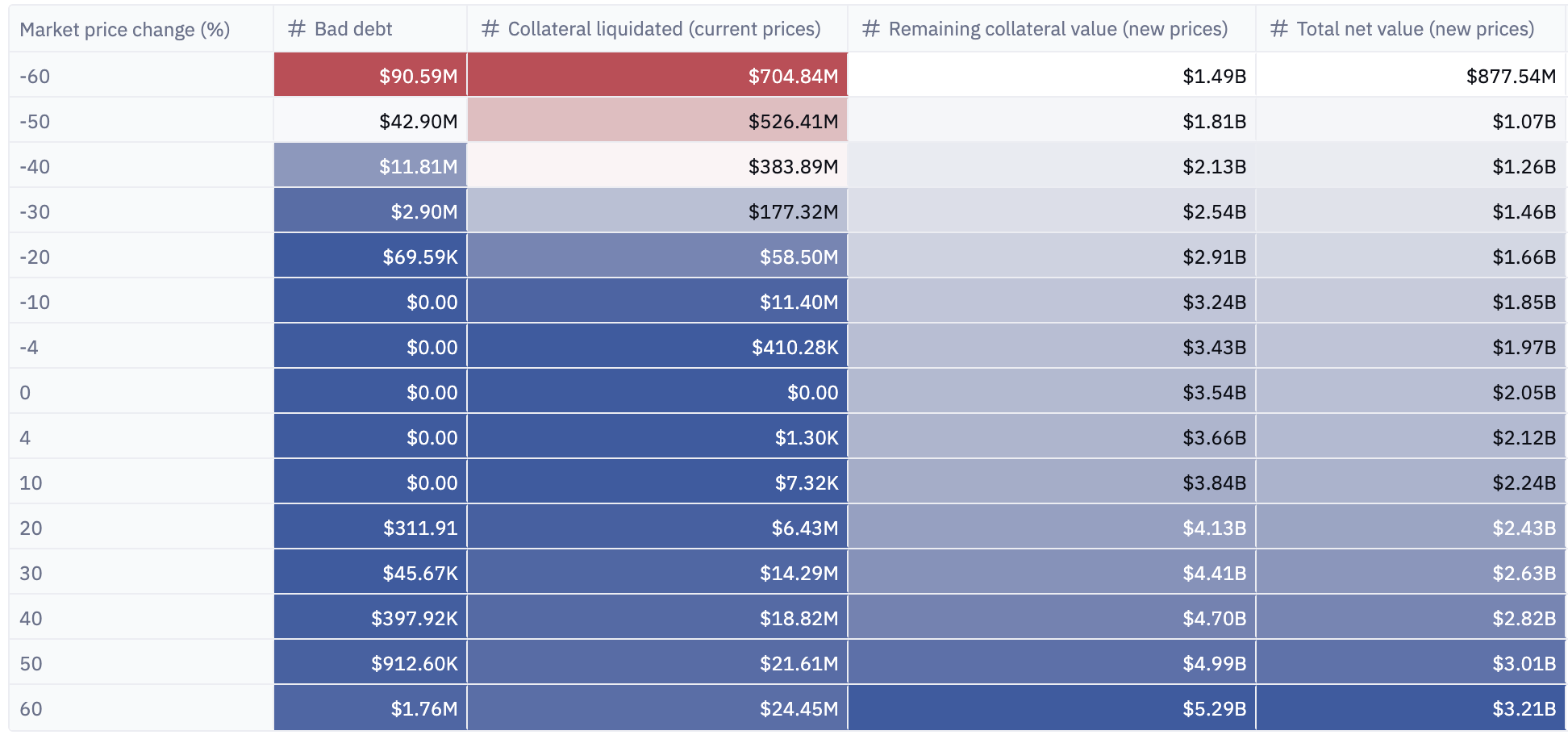 In a 60% crash scenario, liquidation exposure rises to $705M (-18.4% MoM), with potential bad debt reaching $90.6M (-36.6% MoM) under absolute worst case scenarios.