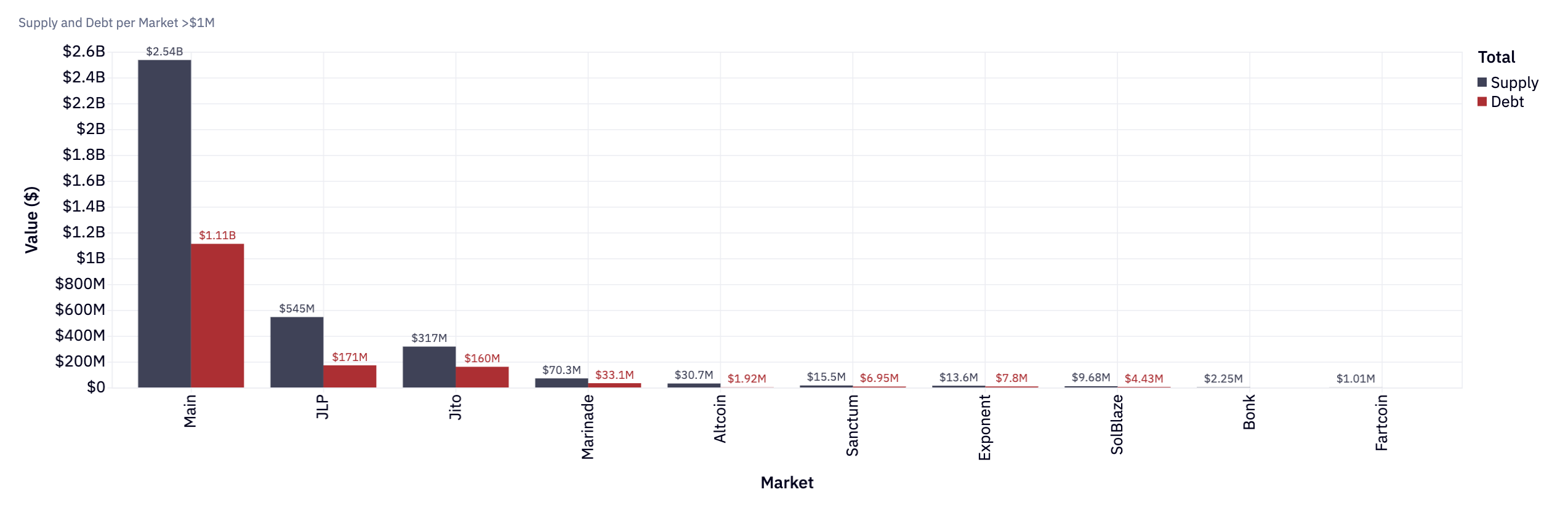 The Marinade Market led with $70.3M in supply and $33.1M in debt, driven by strong demand for mSOL looping. The Sanctum Market followed with $15.5M supplied and $7M borrowed. The Exponent Market, featuring Principal Tokens as collateral, also saw solid adoption, with $13.6M in supply and $7.8M in debt, with good early traction for fixed-income primitives on Solana.
