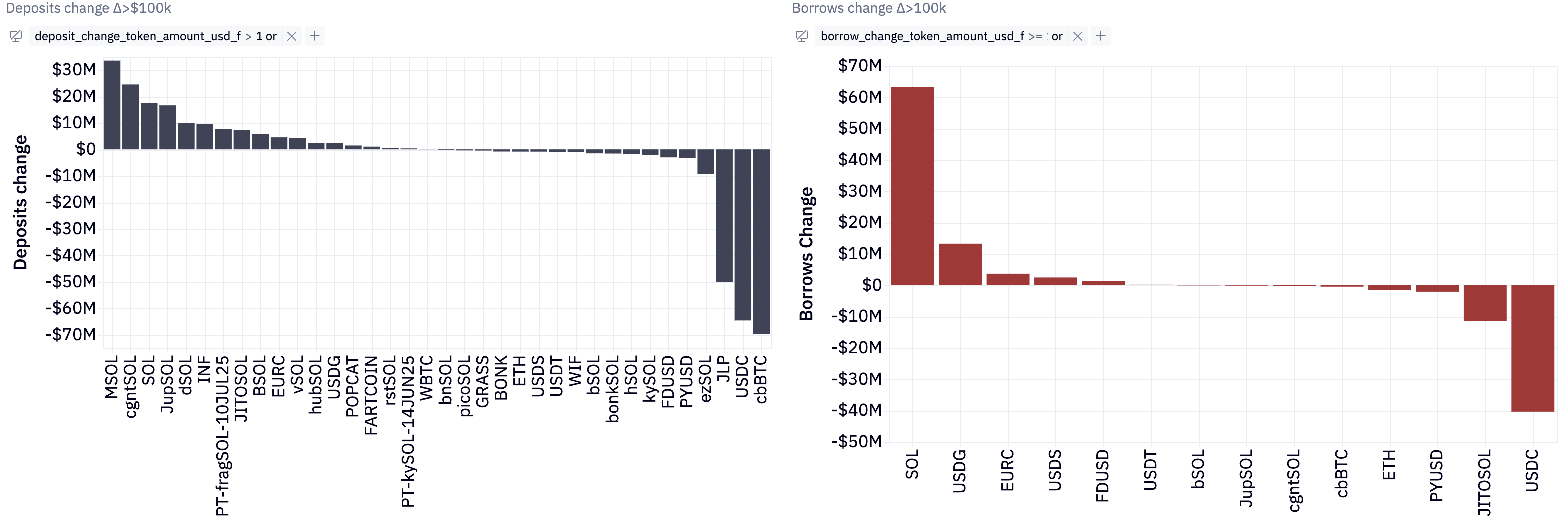 On the asset side, inflows centered around new markets: mSOL (+$33.5M), SOL (+$24.5M), INF (+$9.7M), PT tokens (+$8M), and bSOL (+$5.85M). At the same time, JLP (–$50.1M), USDC (–$64.7M), and cbBTC (–$69.8M) experienced notable outflows as users rotated capital into V2 strategies. The growing share of LST loop vaults also contributed to a $63.2M increase in SOL-denominated debt.