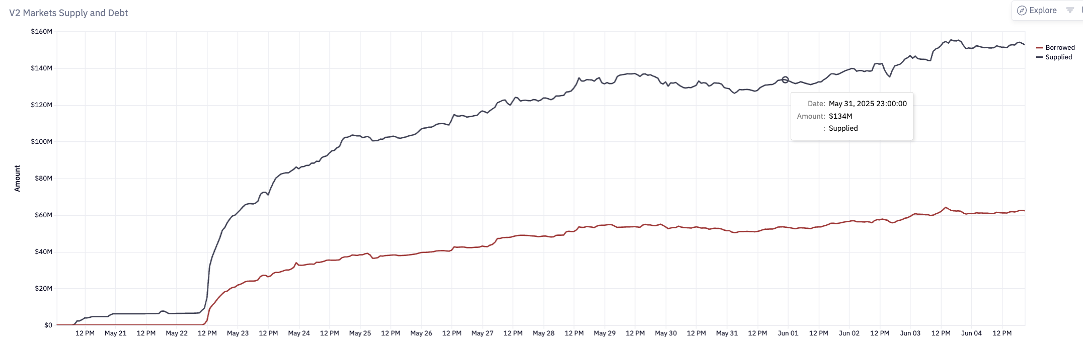 By the end of May, V2 markets had attracted $134M in supply and $53.4M in borrows, despite launching in the final week of the month.