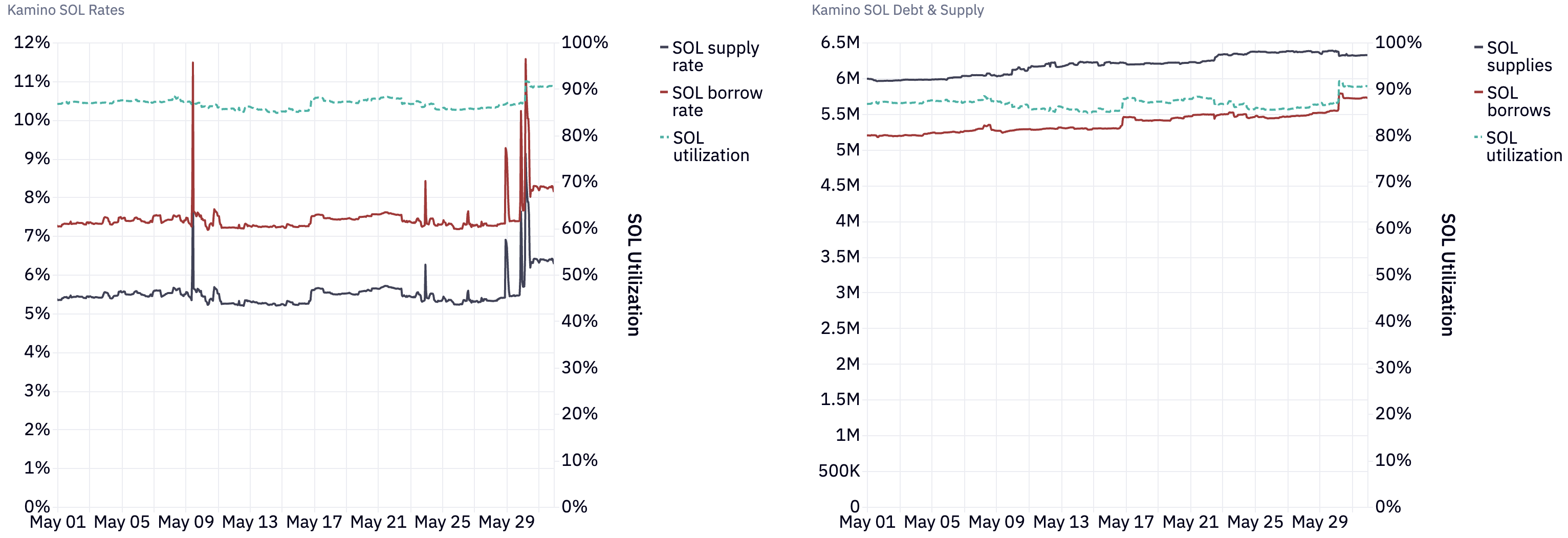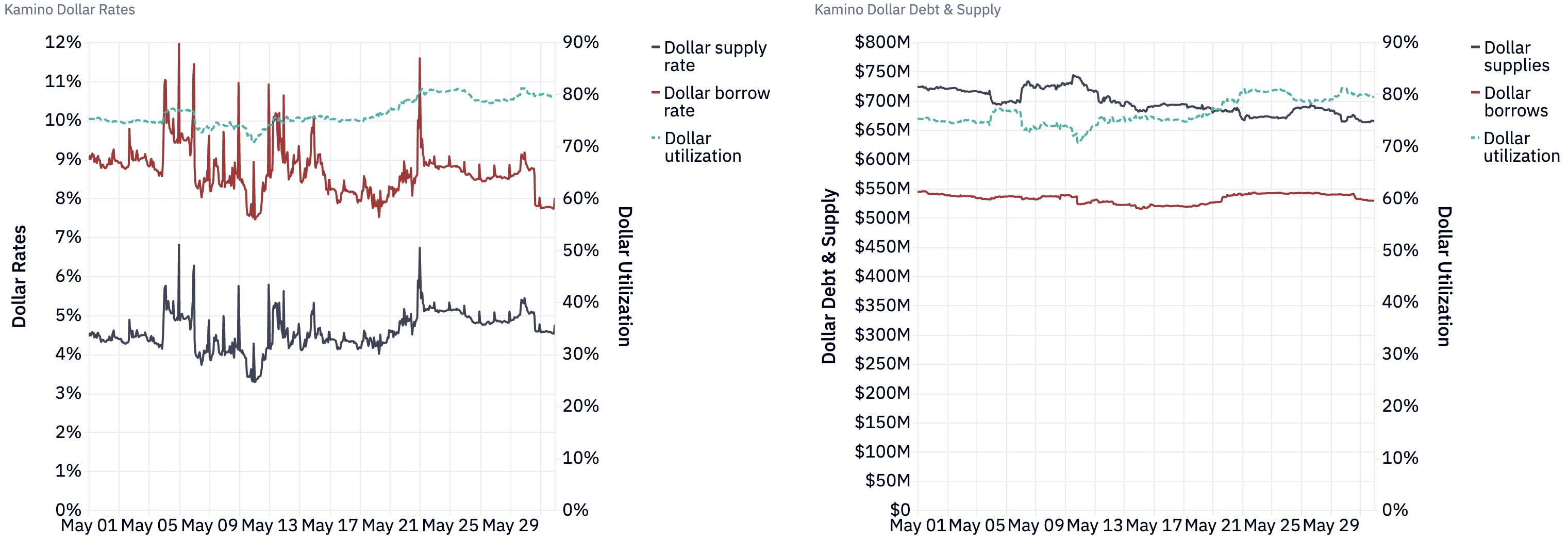 May saw continued strength in Kamino’s core markets, with SOL-denominated strategies accelerating and stablecoin markets experiencing modest rebalancing. Utilization remained healthy across both segments, supporting robust protocol revenue.