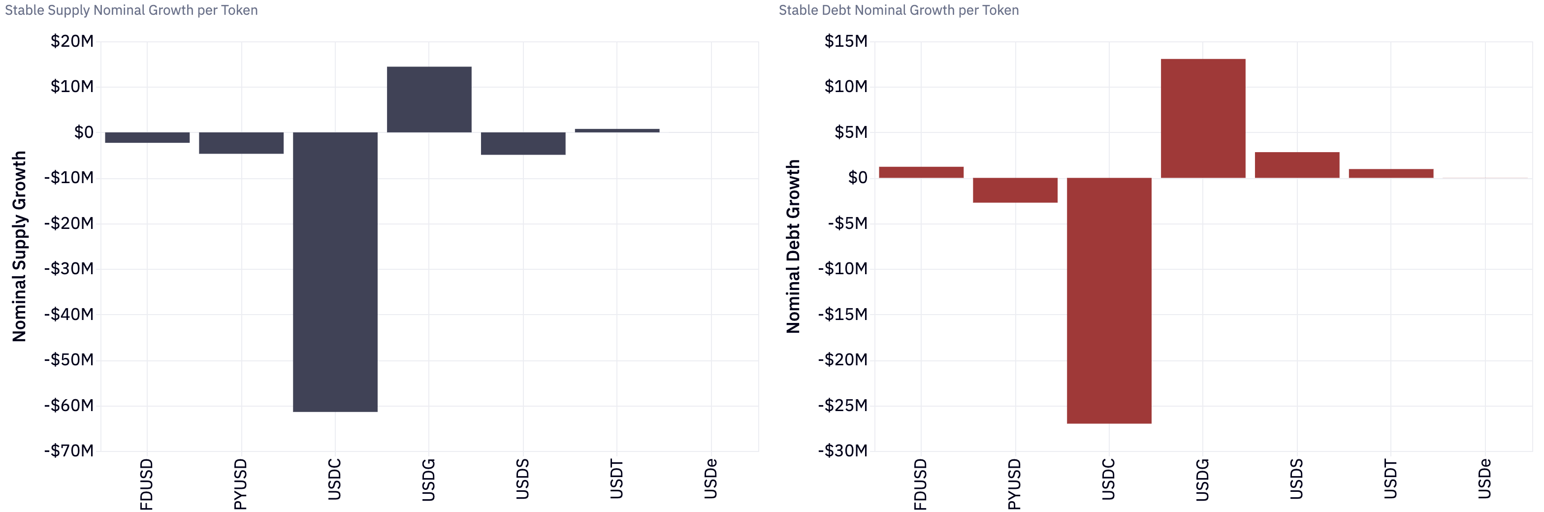 The reduction in supply and debt was primarily concentrated in legacy assets like USDC and PYUSD. By contrast, USDG continued growing supported by incentives.