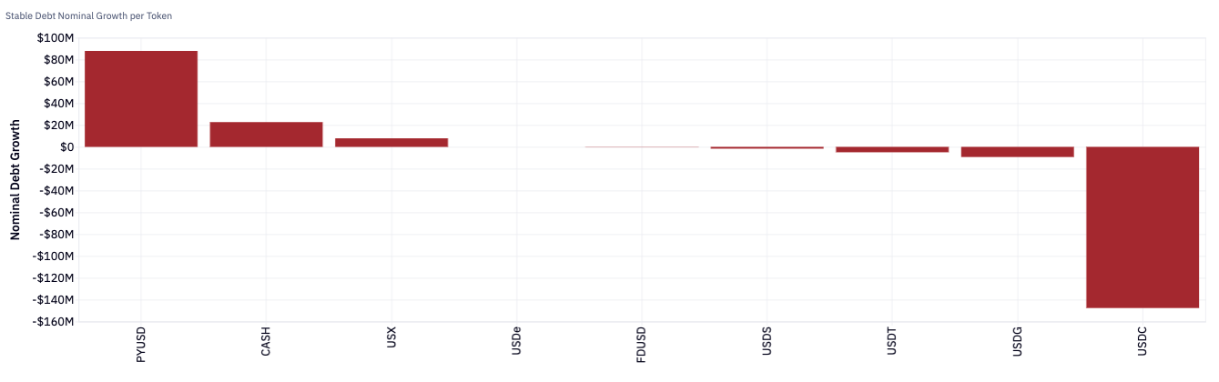 PYUSD: $528M supply (+$85M), $119M debt (+$88M) - significant growth reaching 39% market share, and closing up on USDC