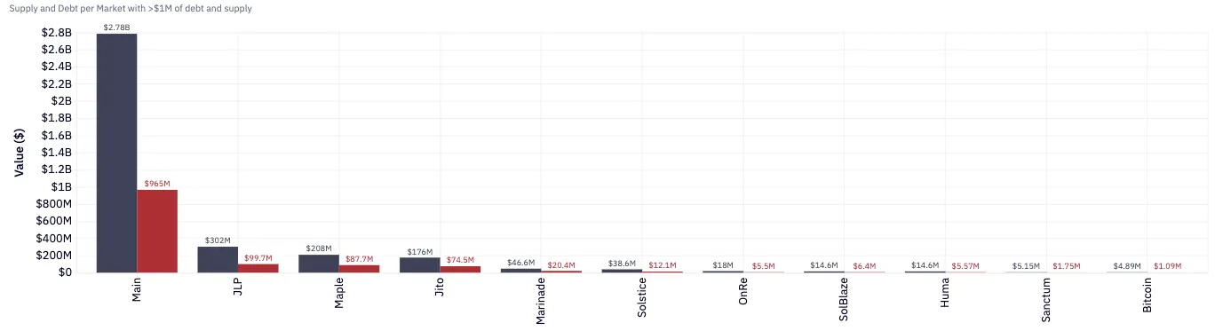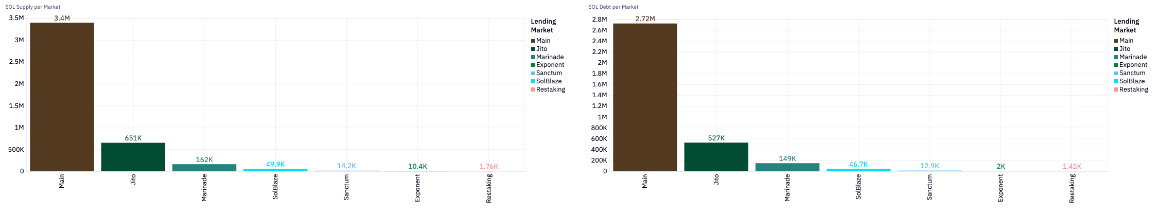 The Main Market absorbed most SOL outflows with 3.4M SOL supply (-12%) while maintaining 83% utilization, indicating sustained borrowing demand despite deleveraging. Jito LST consolidated modestly to 651K SOL (-2%), benefiting from its role as primary liquid staking venue.
