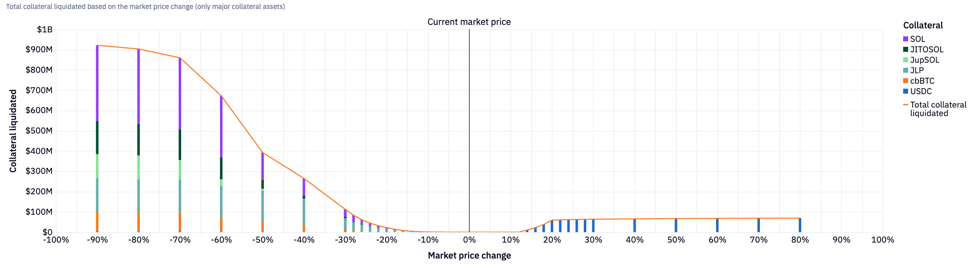 In stress scenarios, dominant collaterals such as SOL, JITOSOL, JupSOL, and JLP would carry the greatest liquidation exposure. However, these assets remain highly liquid on Solana with deep liquidity enabling orderly liquidations.