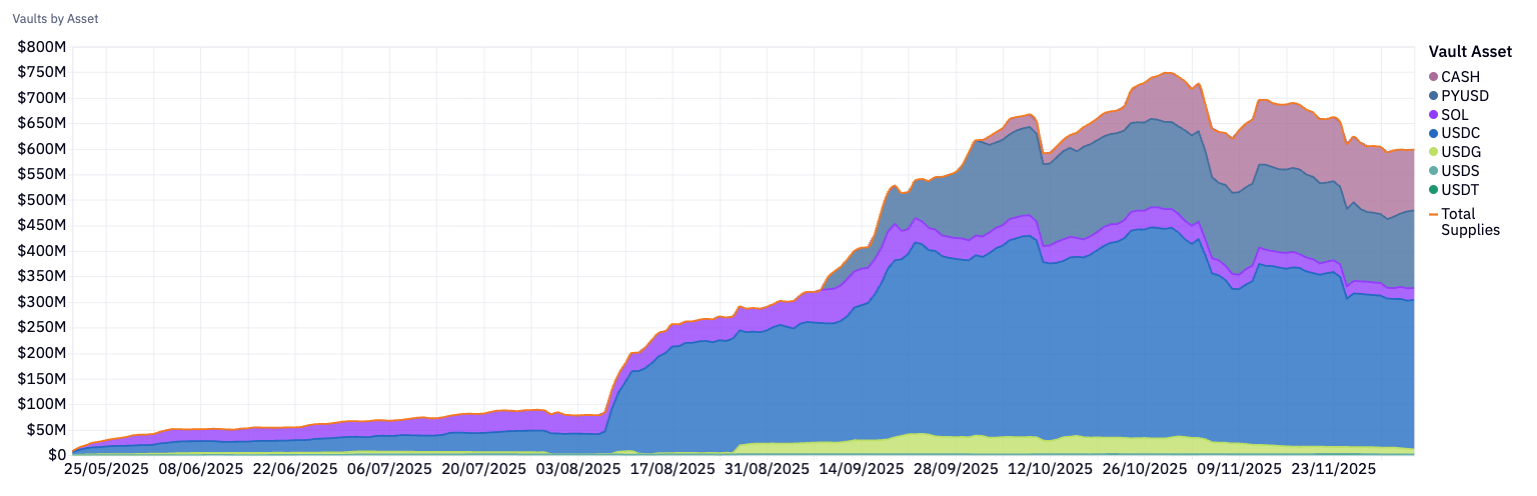 Vaults continue providing critical protocol diversification across three dimensions. Asset diversity spans USDC vaults ($292M, 48%), PYUSD vaults ($135M, 22%), CASH vaults ($130M, 21%) and SOL/LST vaults ($20M+).