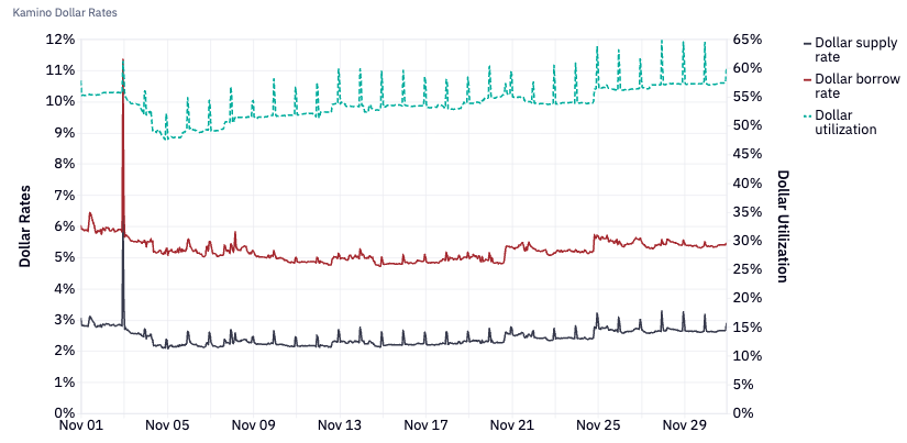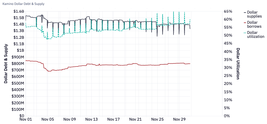 Kamino closed November having successfully navigated challenging market conditions. Supply contracted to $3.6B and debt to $1.3B, reflecting ecosystem-wide deleveraging as SOL's 35% max drawdown drove measured position unwinding.
