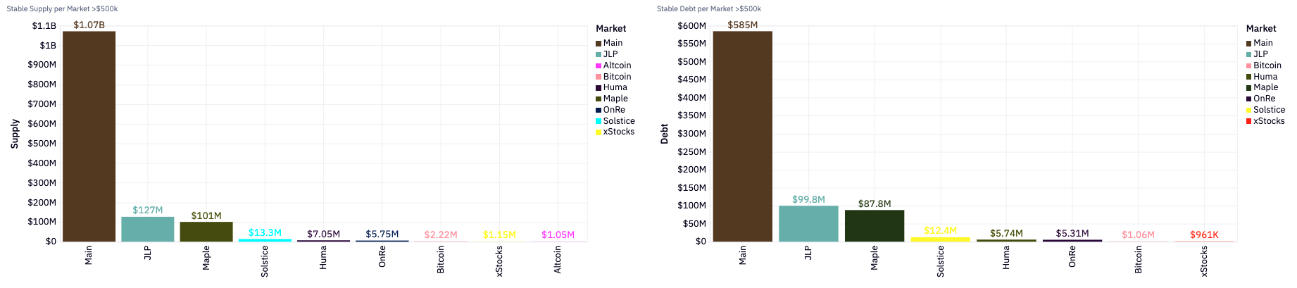 At the market level, the Main Market dominated with $1.07B stablecoin supply (-8%) and $585M debt (-6%), maintaining 55% utilization. Maple stablecoins grew 101M (+33%), driven by institutional credit demand. Solstice stablecoin more than doubled to $13.3M (+135%) with 93% utilization, confirming structured product appetite. JLP stablecoin supply consolidated 18% to $127M as leveraged trading moderated, while smaller RWA markets showed mixed performance.