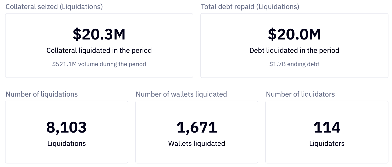 Liquidation activity was distributed across a broad ecosystem of liquidators. A total of 114 participants took part in clearing risky positions. Of these, 4 liquidators each processed more than $1M in seized collateral, and 28 handled over $100k.