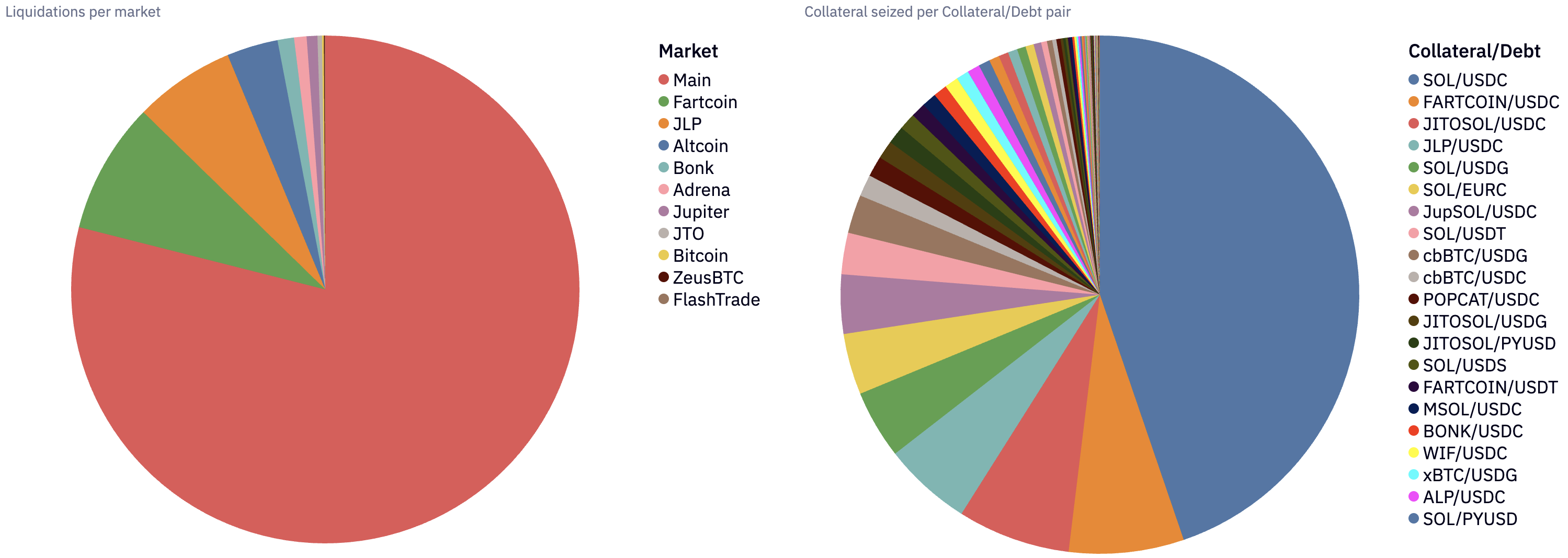 The majority of liquidations occurred in the Main Market ($16M), followed by Fartcoin ($1.7M), JLP ($1.3M), and the Altcoin Market ($666k). SOL long positions dominated, with 58% of seized collateral in SOL and 9.4% in JitoSOL. On the debt side, USDC accounted for 76% of repaid positions, followed by USDG at 9.5%.