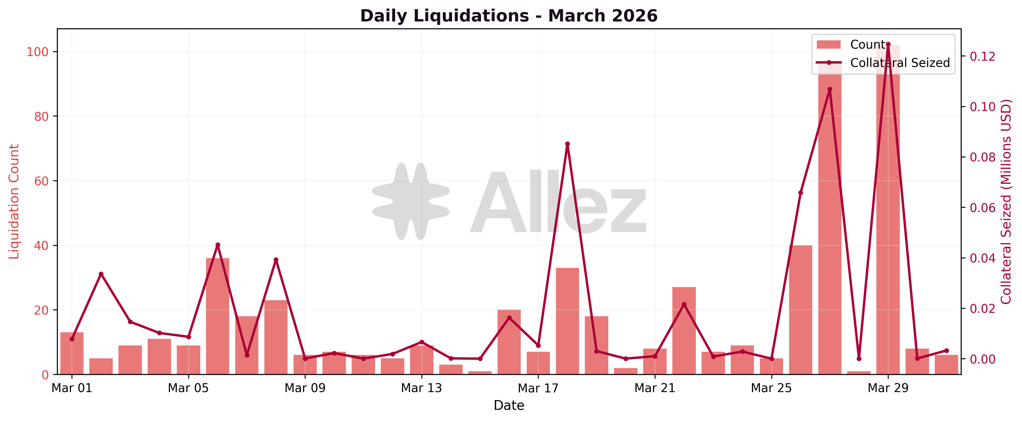 March was the quietest month for liquidations since at least January 2026. The 551 events and $0.61M in collateral seized reflect a post-correction environment where vulnerable positions were already cleared in February. The higher average liquidation size ($1,104 vs $367) indicates that the remaining liquidations were individual position closures rather than the mass micro-liquidation events that characterized February.