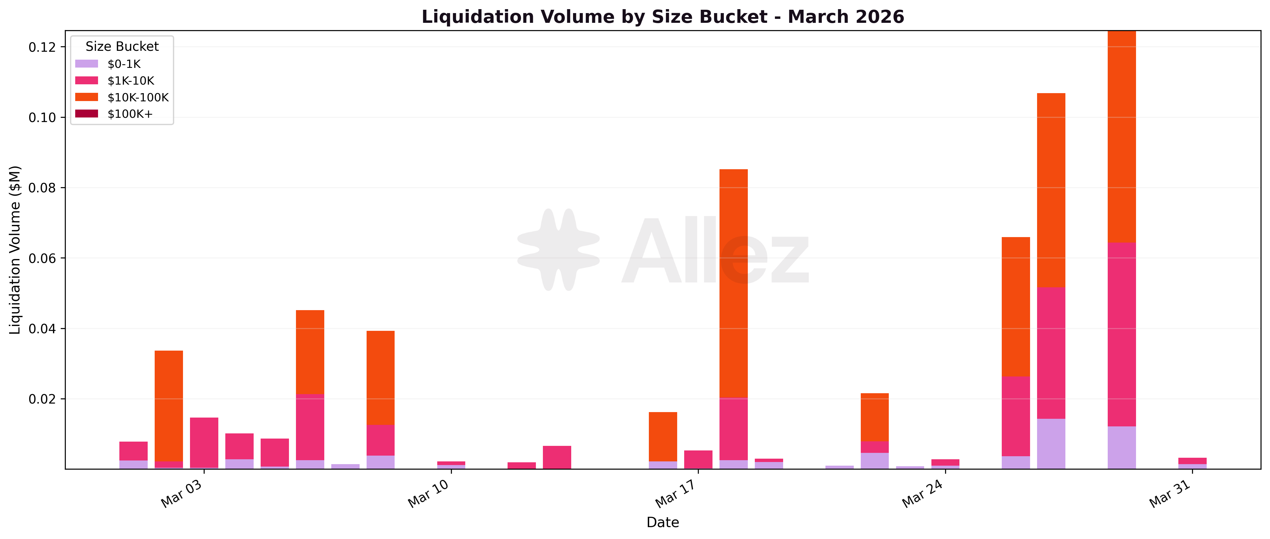 No $100K+ liquidations occurred in March, a sharp contrast to February's 29 events totaling $4.7M. The $10K-100K bucket accounted for the majority of volume (54%) from just 17 events. Sub-$1K events represented 82% of all liquidations but only 10% of volume.