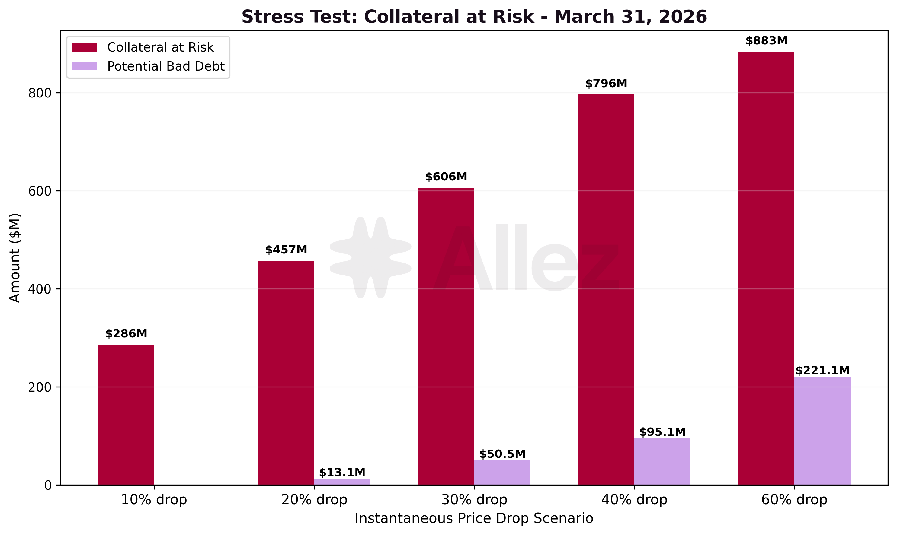 At a 10% instantaneous drop, $300M of collateral would be at risk (+5% vs February's $286M), reflecting a slightly higher density of positions near the 10% threshold as the protocol grew. At deeper scenarios (40-60%), collateral at risk declined significantly (-43% to -53%), consistent with the healthier risk profile: February's correction already cleared positions that would have been vulnerable at these levels.