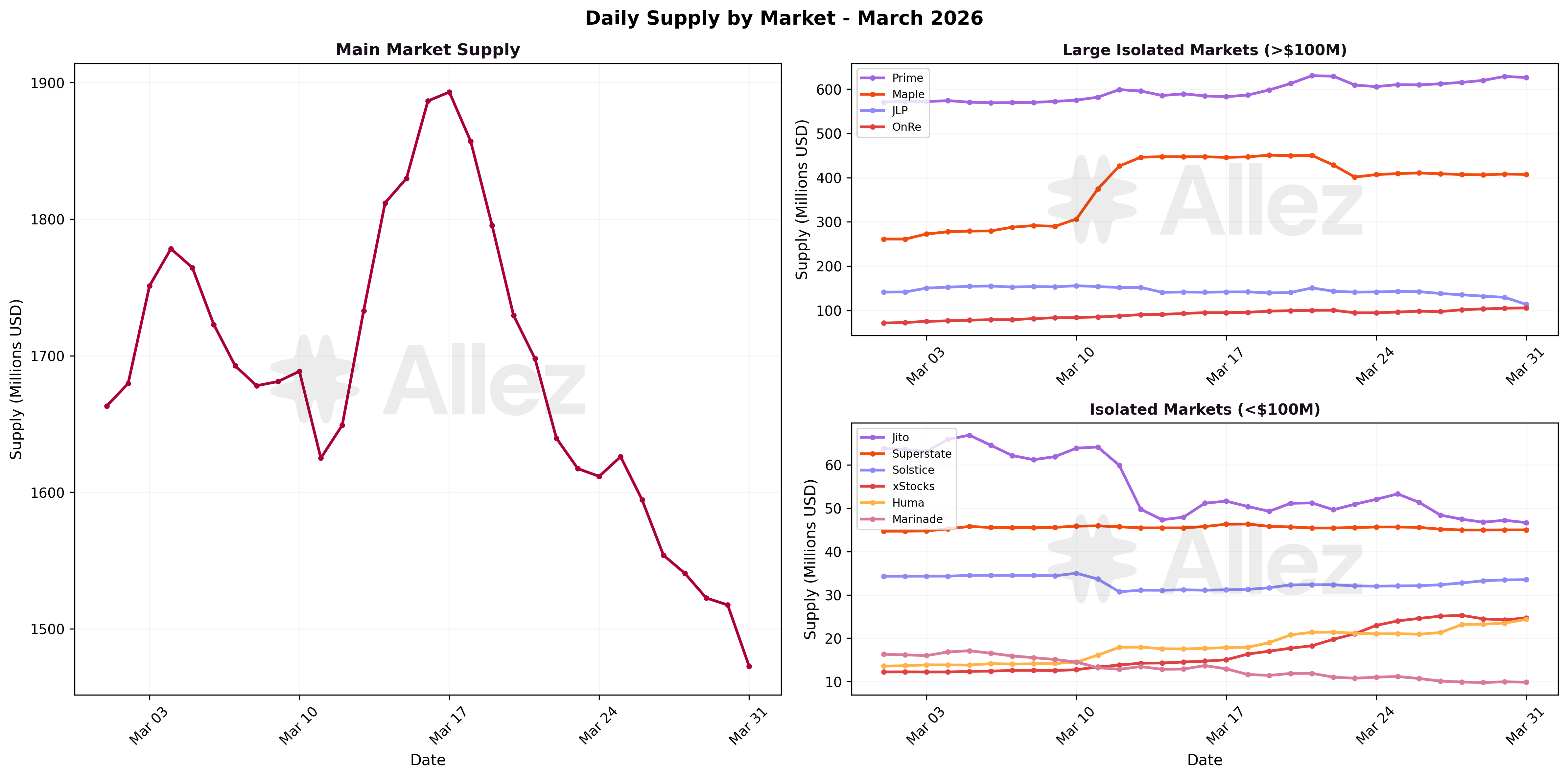 The market landscape shifted notably in March. Maple emerged as the standout growth story, surging +55.5% to $407M, strengthening its position as the third-largest market. Main Market continued to contract (-9.6% to $1,473M) as capital migrated toward specialized markets offering higher yields.