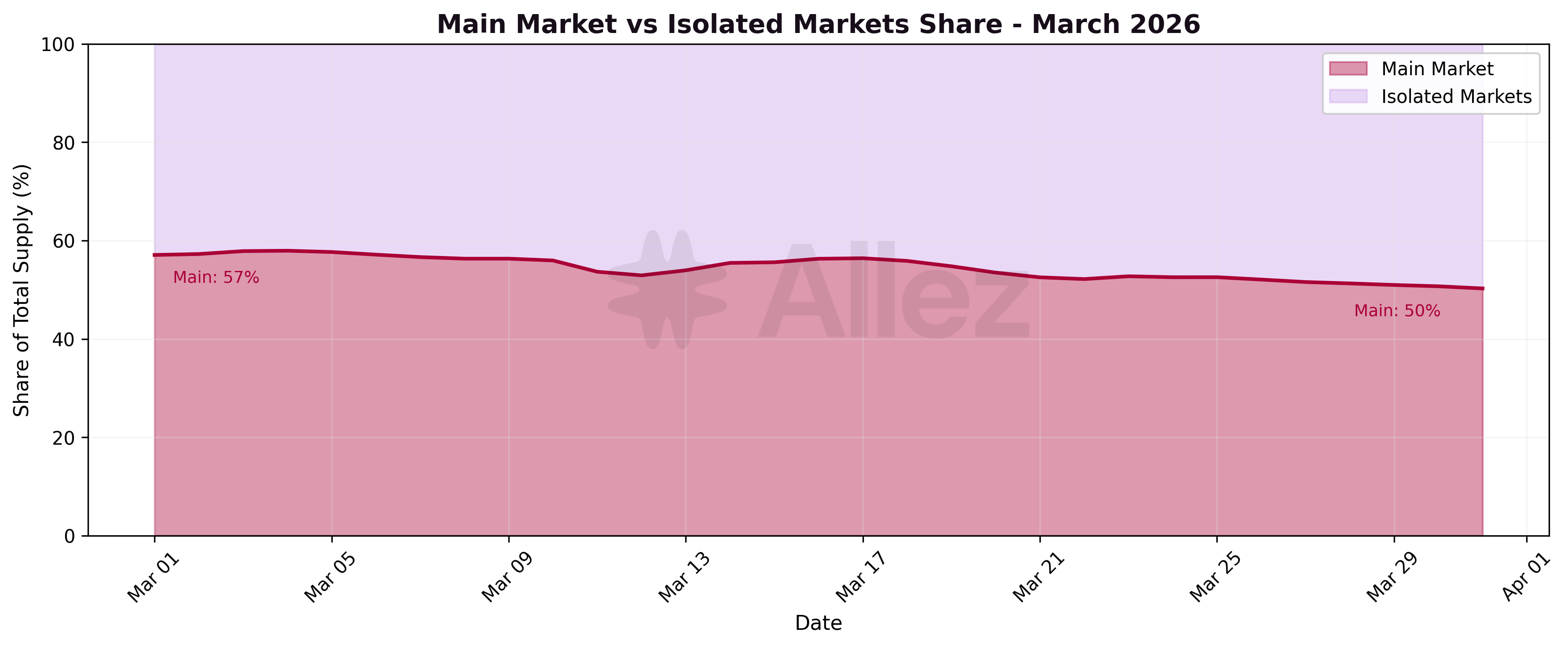 Main Market share declined from 57% to 50% during March, continuing the structural trend toward isolated markets. The combined share of Prime, Maple, and OnRe grew from 32% to 39%.