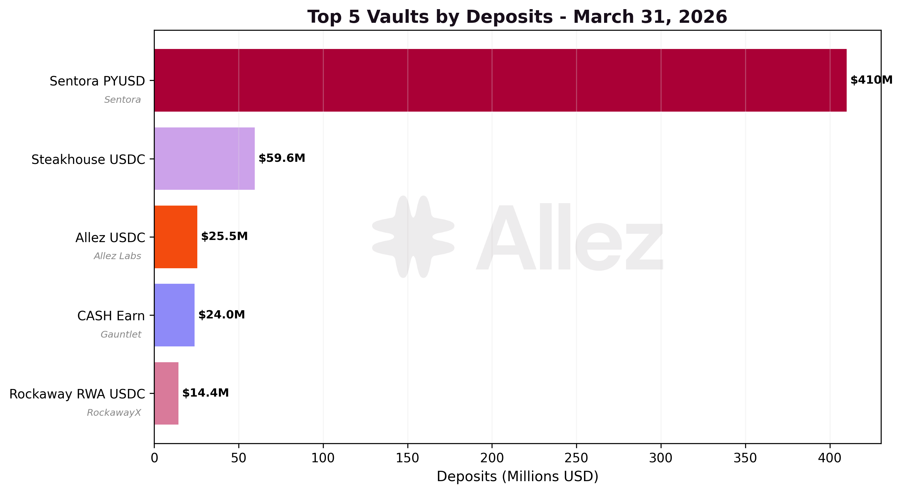 Steakhouse USDC declined from $73M to $60M (-18%), continuing the post-Season 4 incentive contraction. Without the yield premium that sustained deposits at elevated levels, capital rotated toward higher-yielding alternatives. Allez USDC grew +24% to $26M with a competitive 4.7% APY.