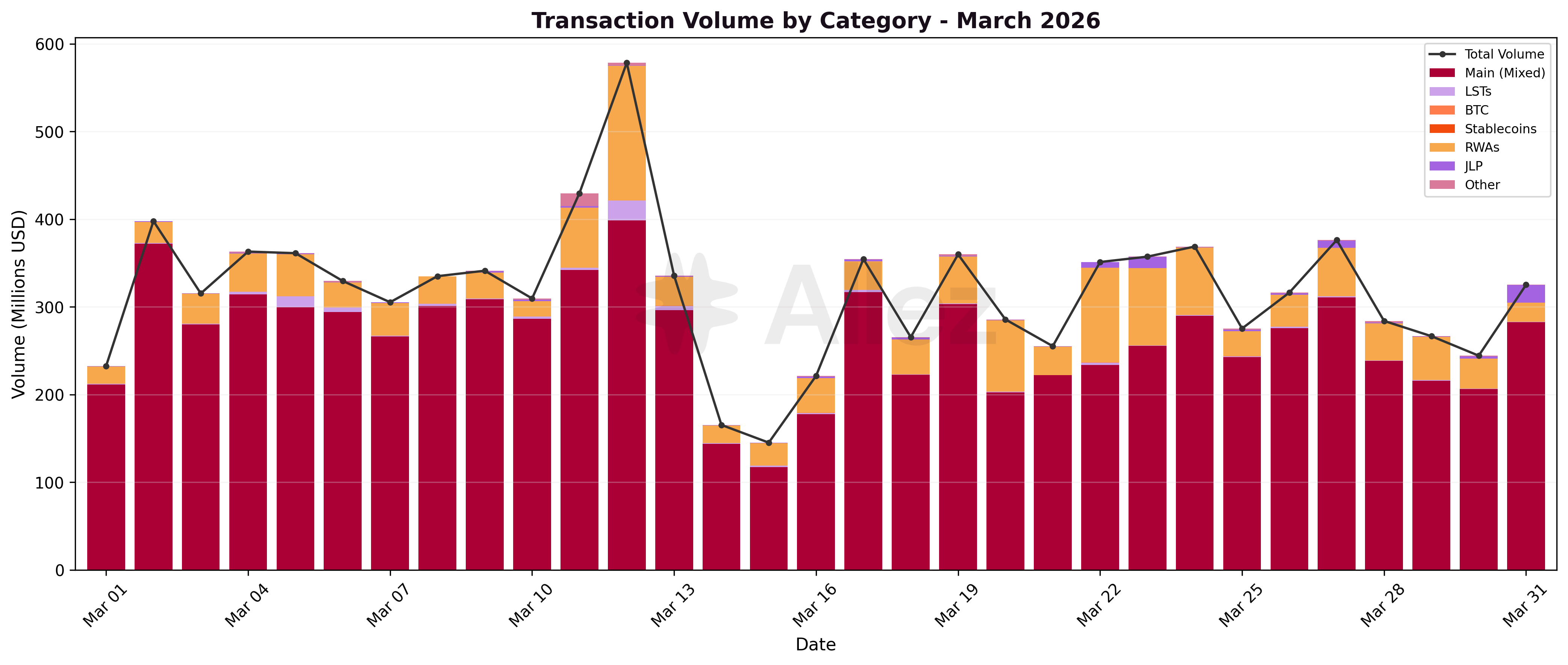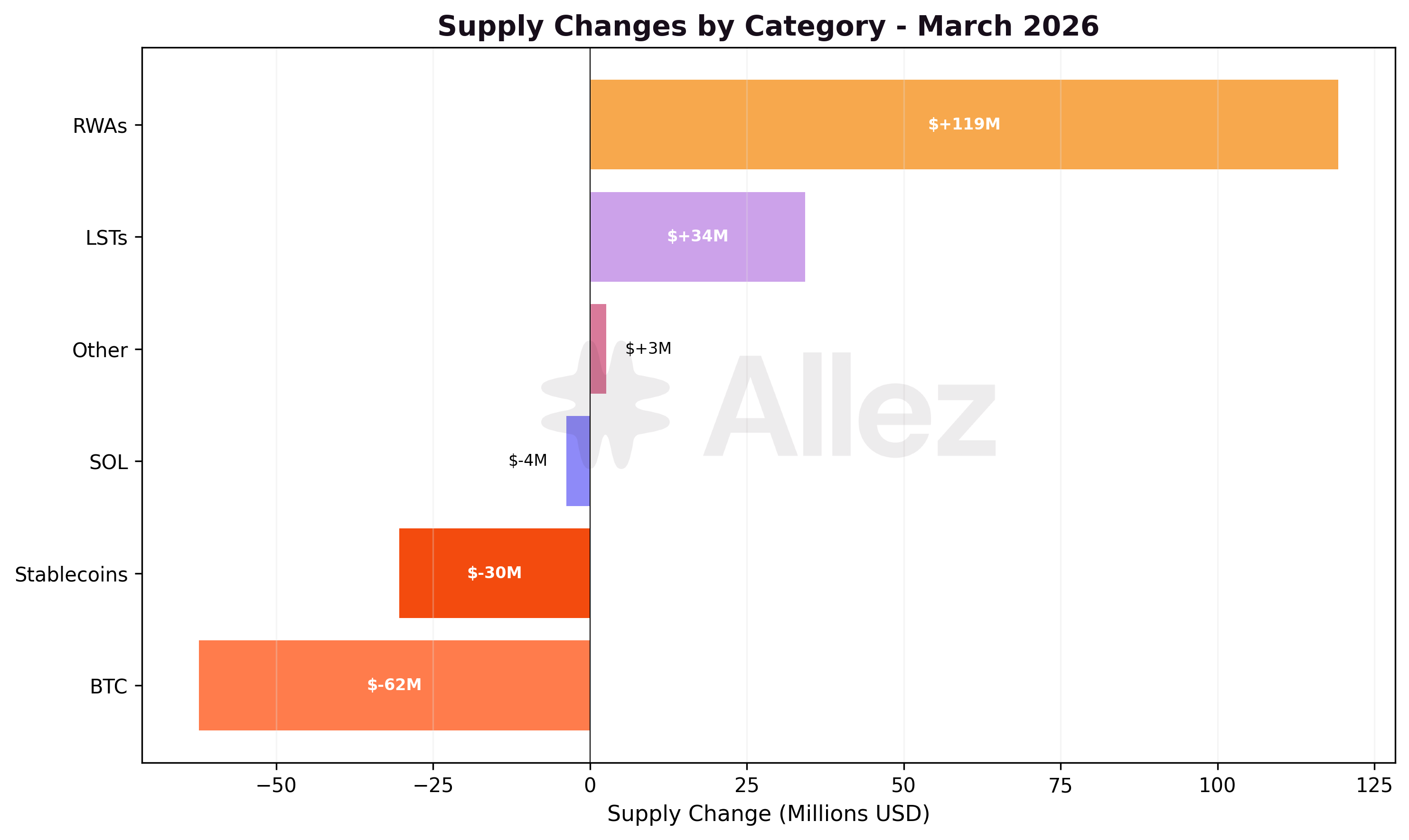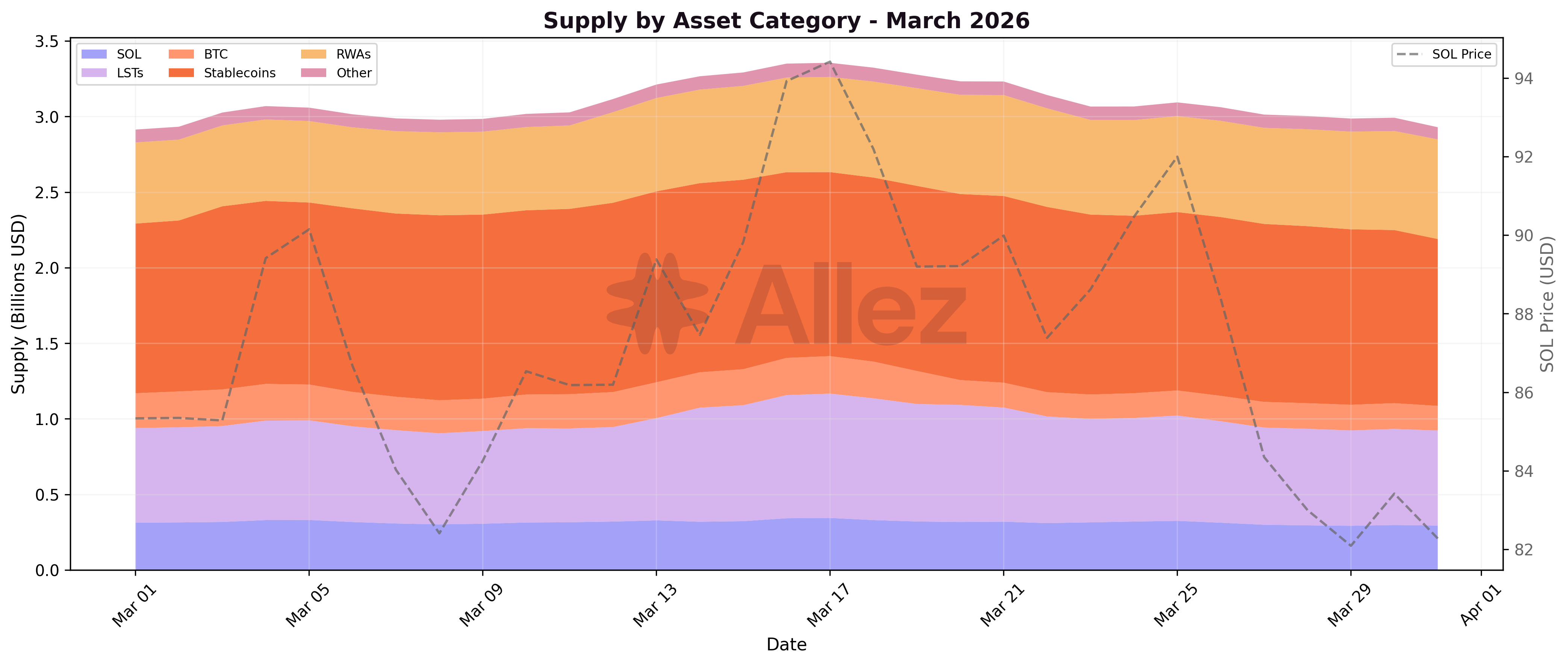 Daily category trends show relative stability compared to February's sharp step-downs. RWA supply grew steadily throughout the month, while stablecoins and SOL/LSTs remained flat. BTC supply declined gradually as cbBTC withdrawals occurred over multiple weeks.