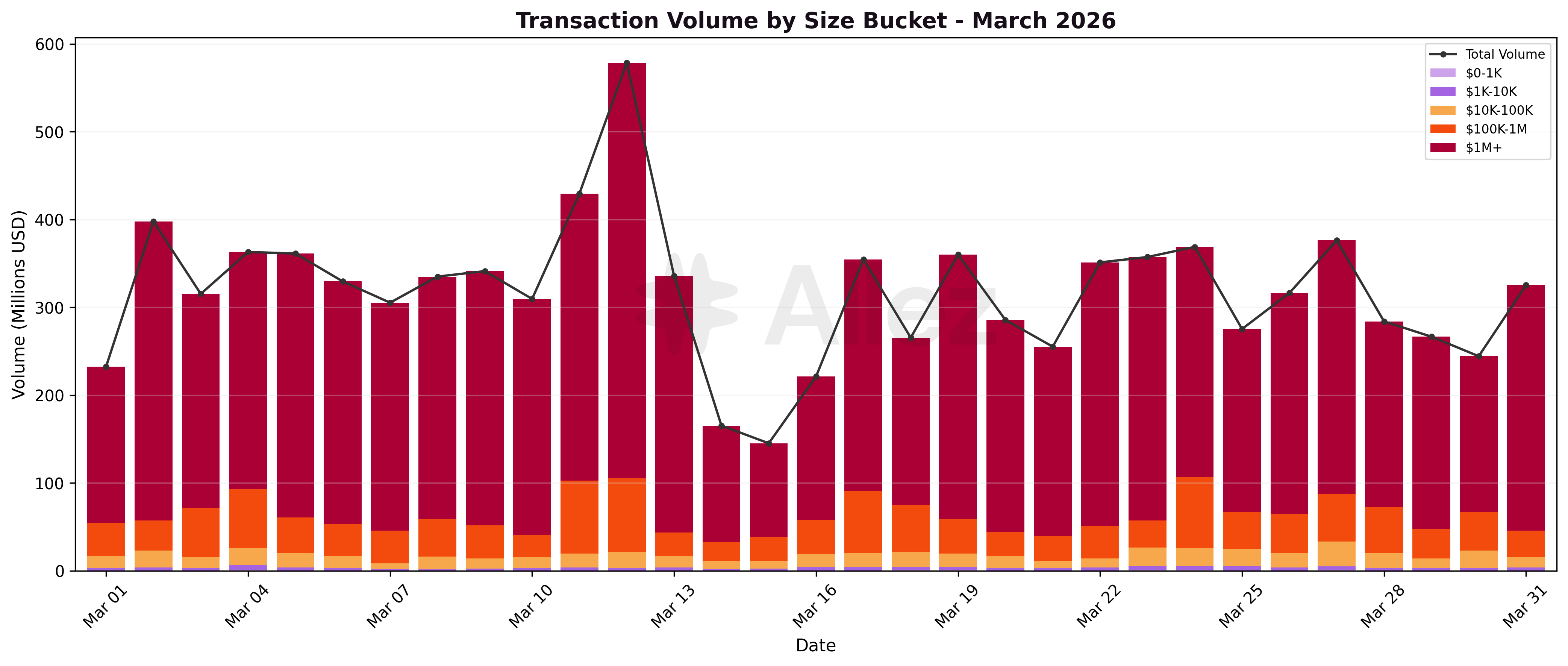 Total transaction volume rose +52% to $9.9B across 136,344 transactions. Despite the higher volume, transaction count fell -58% as February's flood of micro-liquidation transactions (67,825 sub-$1K events) did not recur.