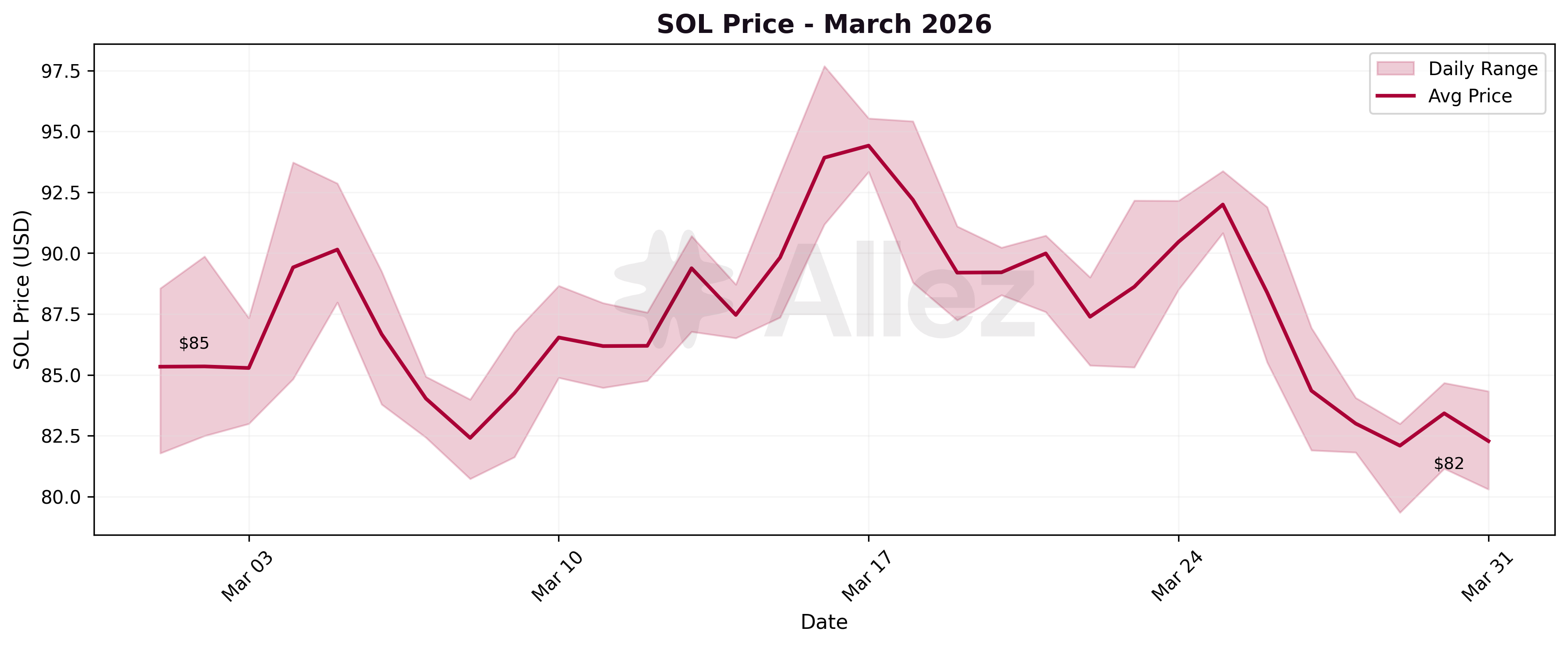 March experienced price consolidation within a lower volatility range. SOL opened at $85, briefly rallied to $98 mid-month (March 16), then drifted lower to close at $82. The narrower trading range ($79-$98, a $19 spread) compared to February's $68-$104 ($36 spread) reflects the calmer conditions.