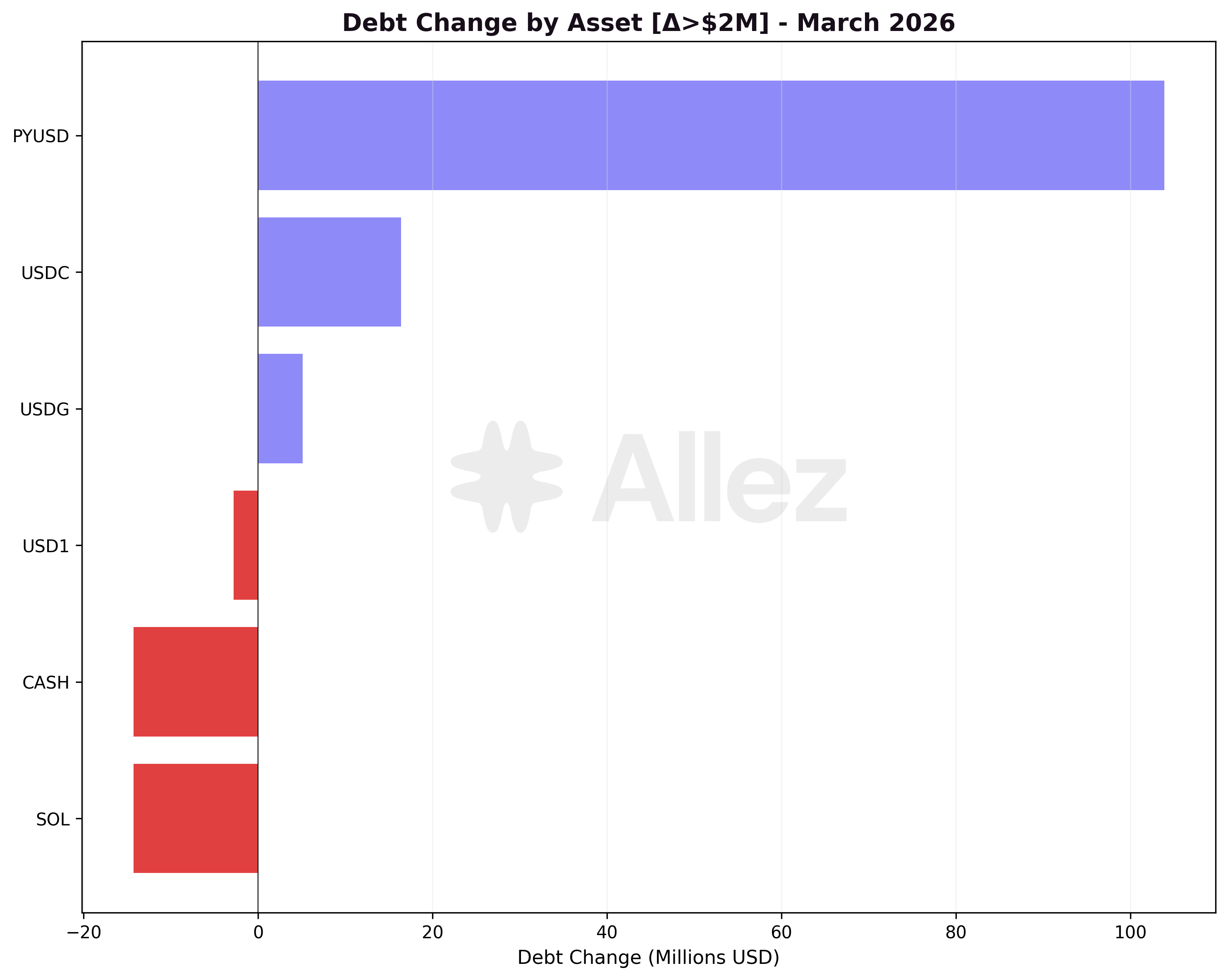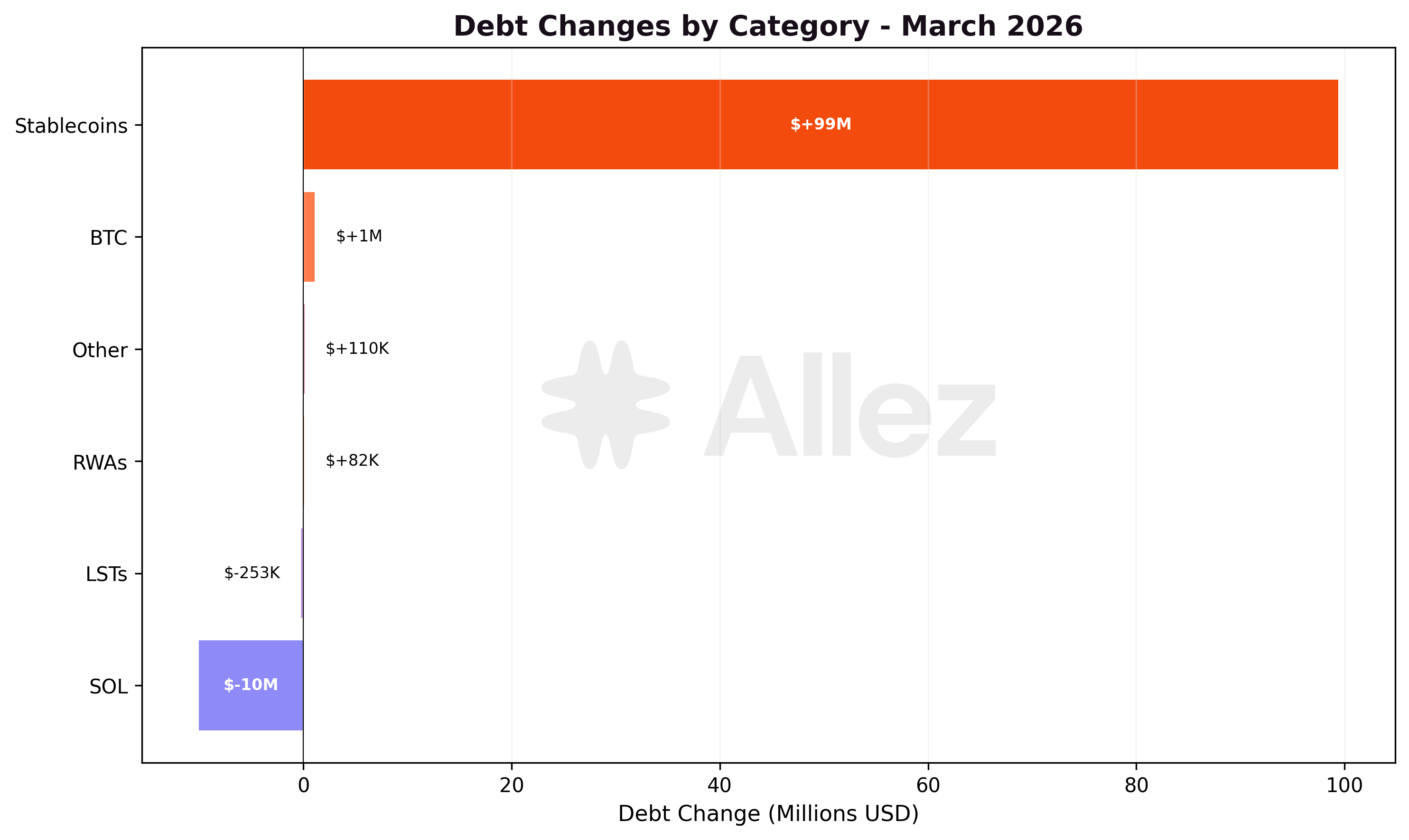 | Category | Top Assets (by supply) | Mar Supply | Mar Debt | MoM Supply |