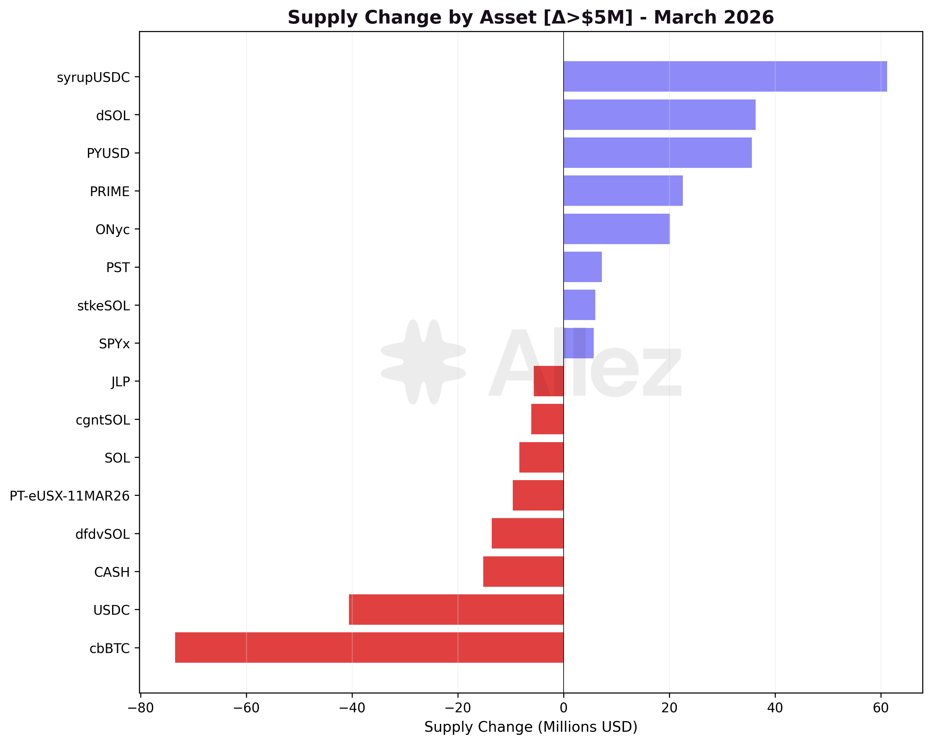 BTC: -27.7% ($225M to $163M). cbBTC withdrew -$73.5M (-34.3%), confirmed as physical token outflows since BTC price was flat at ~$67-68K through March. fBTC partially offset with +$3.6M. The destination of cbBTC outflows warrants monitoring.
