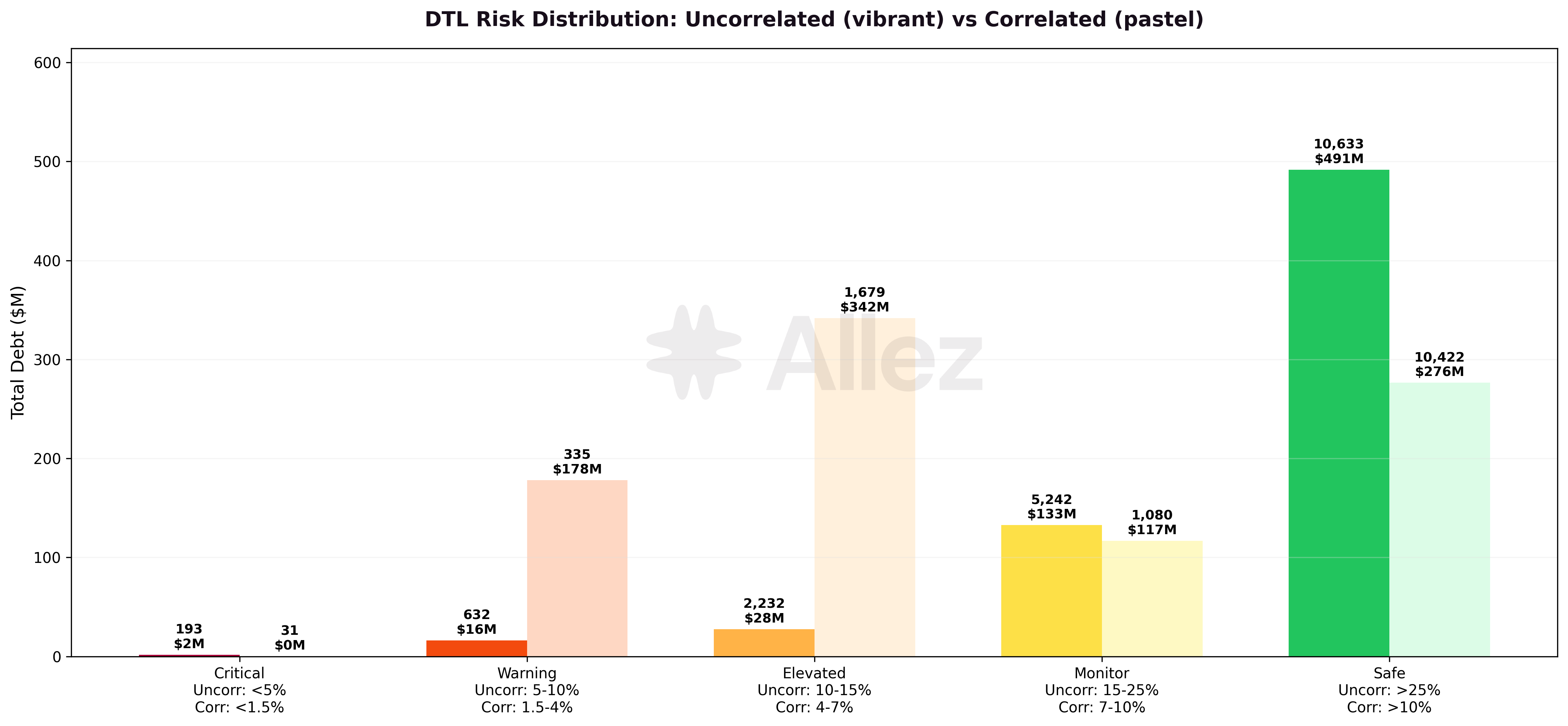 The Elevated tier in correlated positions grew +52% ($225M to $342M), reflecting RWA markets (Prime, OnRe) where high-LTV parameters structurally concentrate positions in narrow DTL bands. This is by design rather than a risk concern.